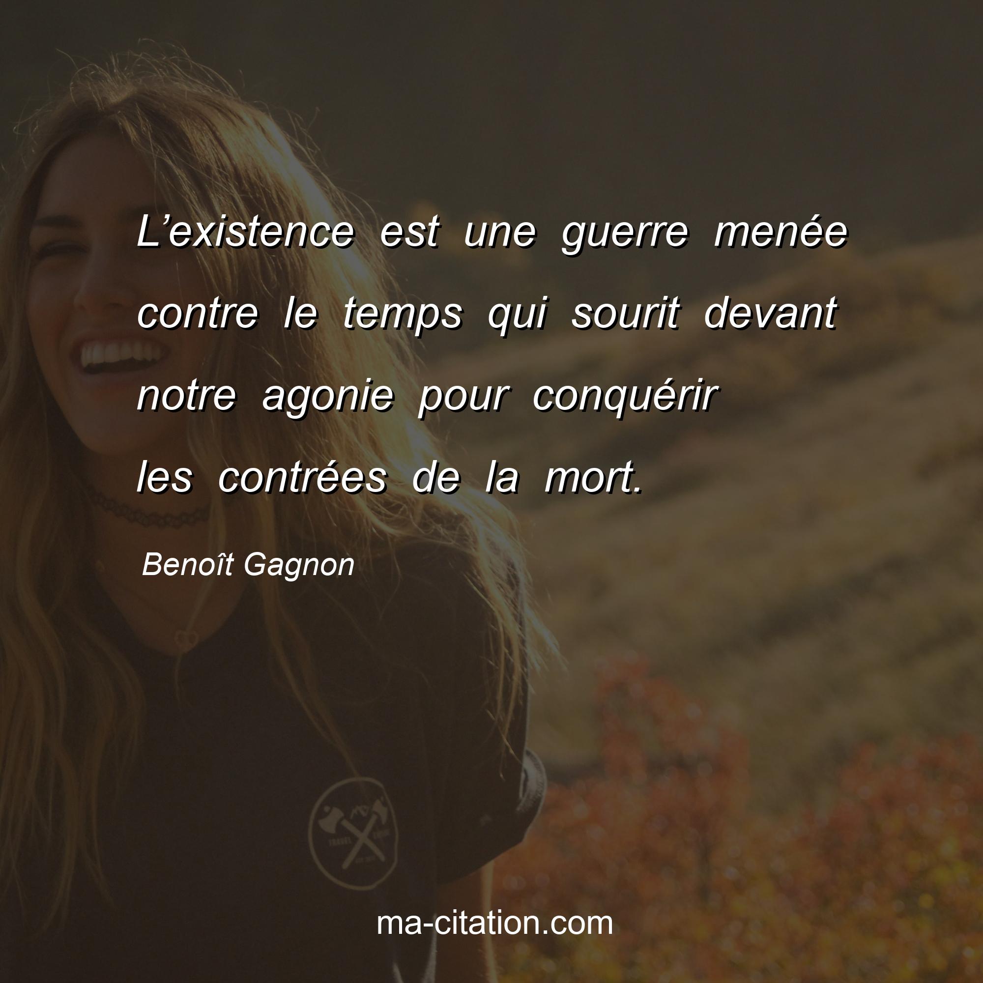Benoît Gagnon est l'auteur de la citation sur la vie "L’existence est une guerre menée contre le temps qui sourit devant notre agonie pour conquérir les contrées de la mort.".