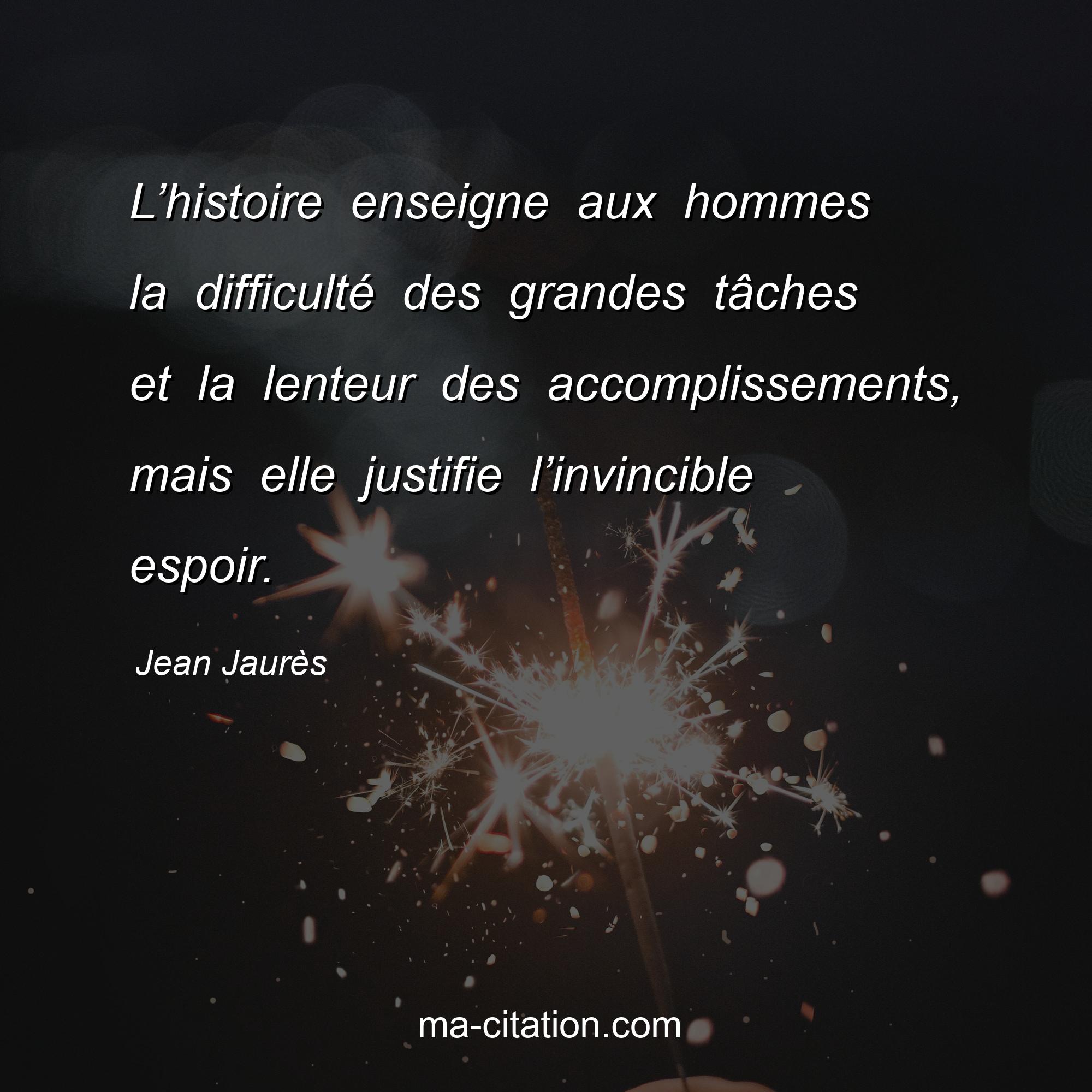 Citation sur la vie de Jean Jaurès :L’histoire enseigne aux hommes la difficulté des grandes tâches et la lenteur des accomplissements, mais elle justifie l’invincible espoir.