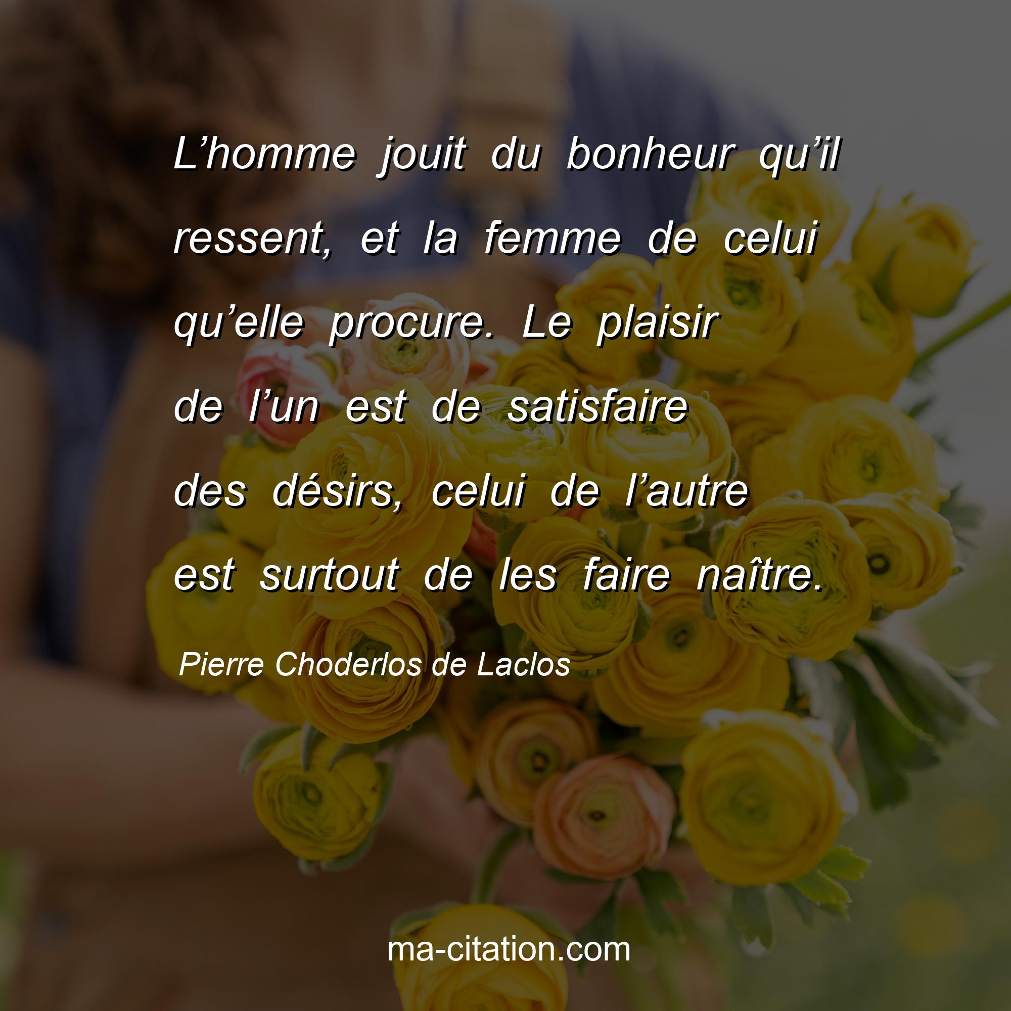 Citation sur la vie de Pierre Choderlos de Laclos :L’homme jouit du bonheur qu’il ressent, et la femme de celui qu’elle procure. Le plaisir de l’un est de satisfaire des désirs, celui de l’autre est surtout de les faire naître.