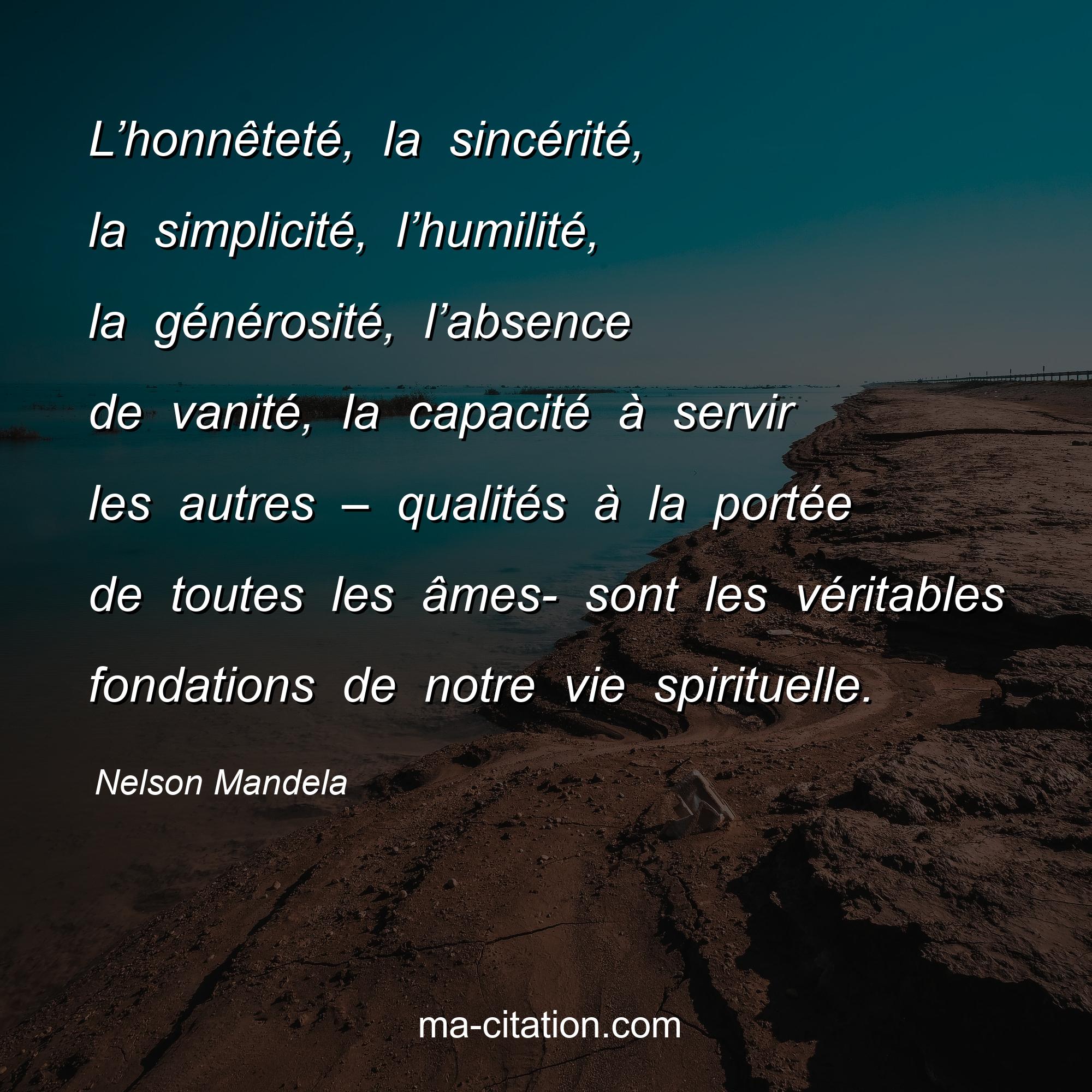 Citation sur la vie de Nelson Mandela :L’honnêteté, la sincérité, la simplicité, l’humilité, la générosité, l’absence de vanité, la capacité à servir les autres – qualités à la portée de toutes les âmes- sont les véritables fondations de notre vie spirituelle.