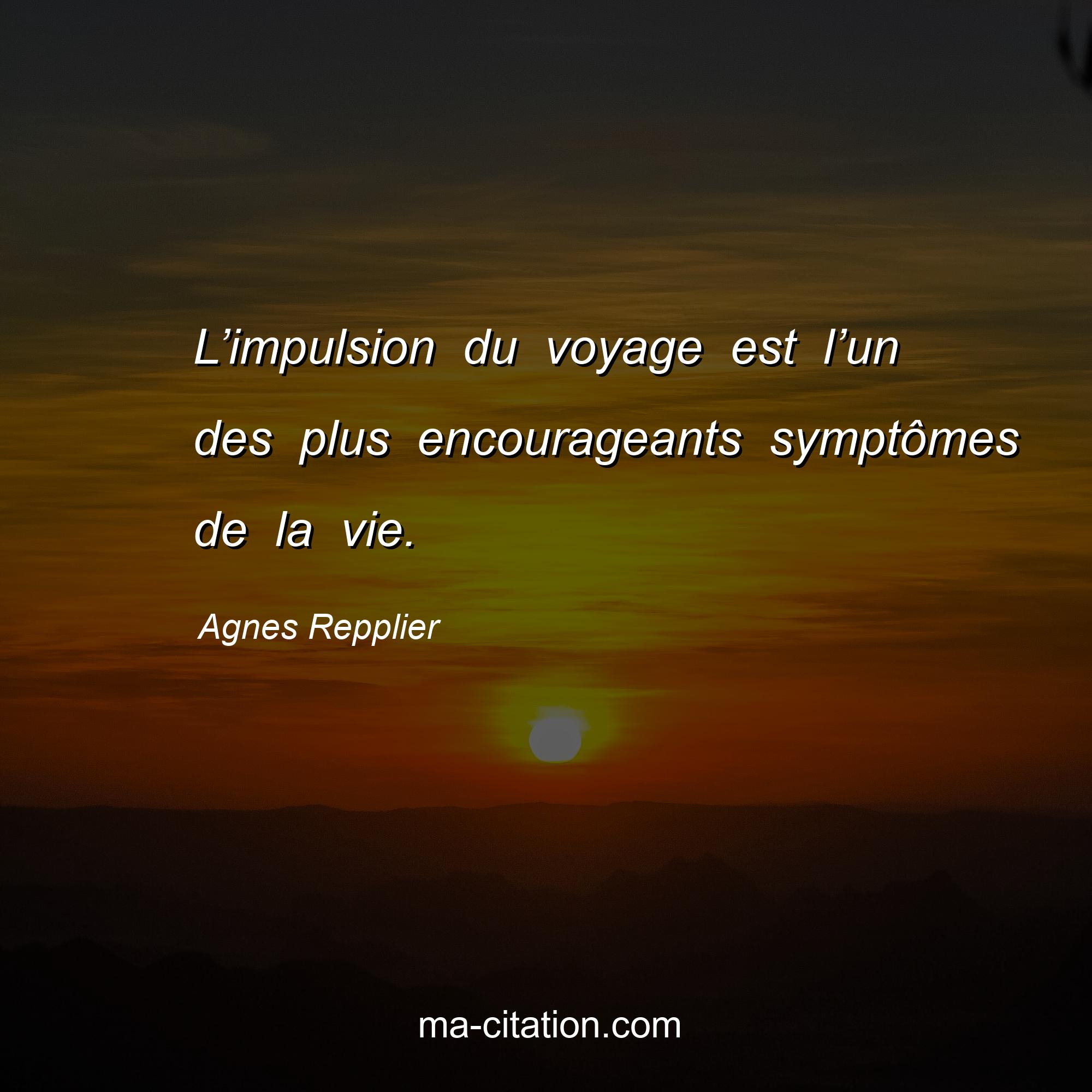 Agnes Repplier est l'auteur de la citation sur la vie "L’impulsion du voyage est l’un des plus encourageants symptômes de la vie.".