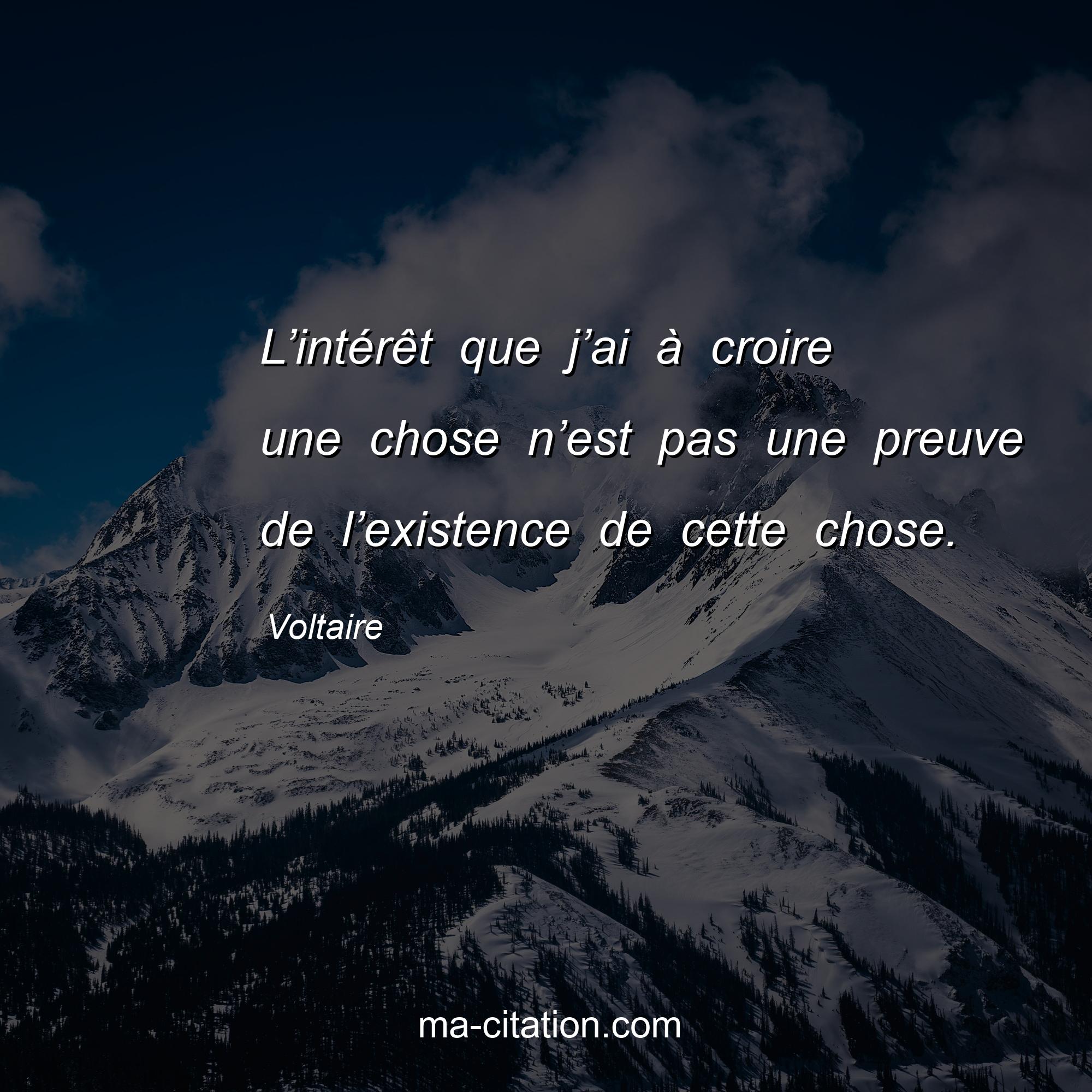 Citation sur la vie de Voltaire :L’intérêt que j’ai à croire une chose n’est pas une preuve de l’existence de cette chose.