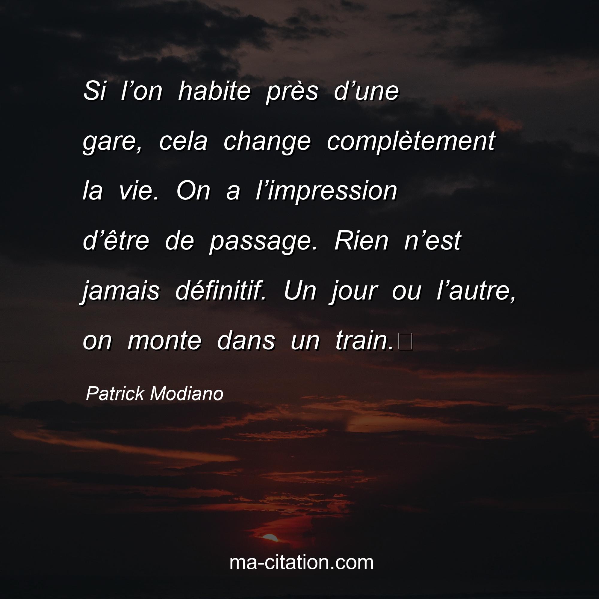 Patrick Modiano est l'auteur de la citation sur la vie "Si l’on habite près d’une gare, cela change complètement la vie. On a l’impression d’être de passage. Rien n’est jamais définitif. Un jour ou l’autre, on monte dans un train.".