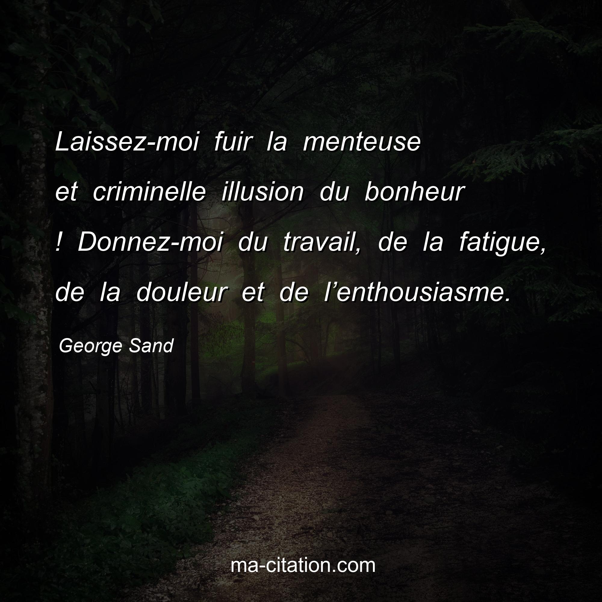George Sand est l'auteur de la citation sur la vie "Laissez-moi fuir la menteuse et criminelle illusion du bonheur ! Donnez-moi du travail, de la fatigue, de la douleur et de l’enthousiasme.".