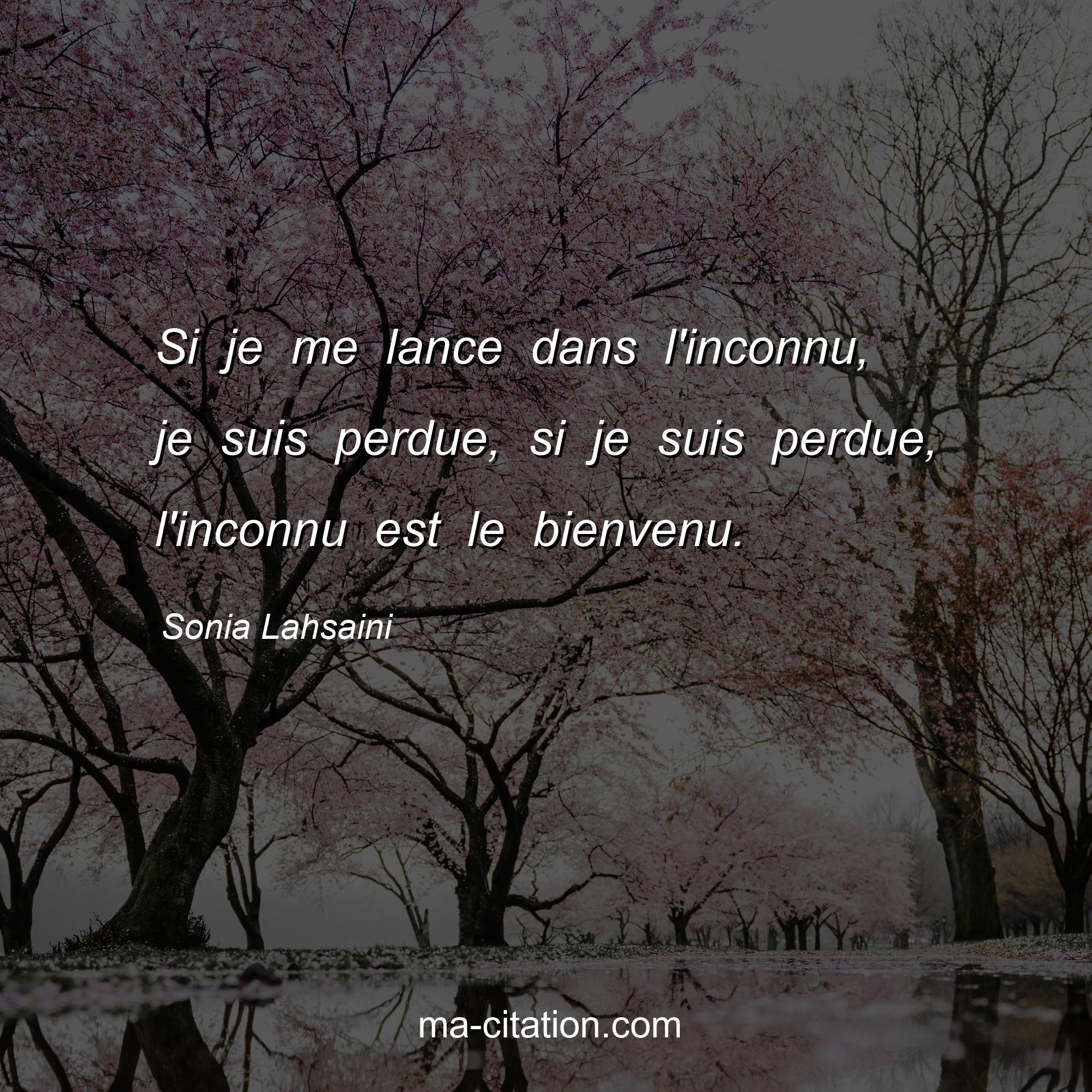 Sonia Lahsaini est l'auteur de la citation sur la vie "Si je me lance dans l'inconnu, je suis perdue, si je suis perdue, l'inconnu est le bienvenu.".