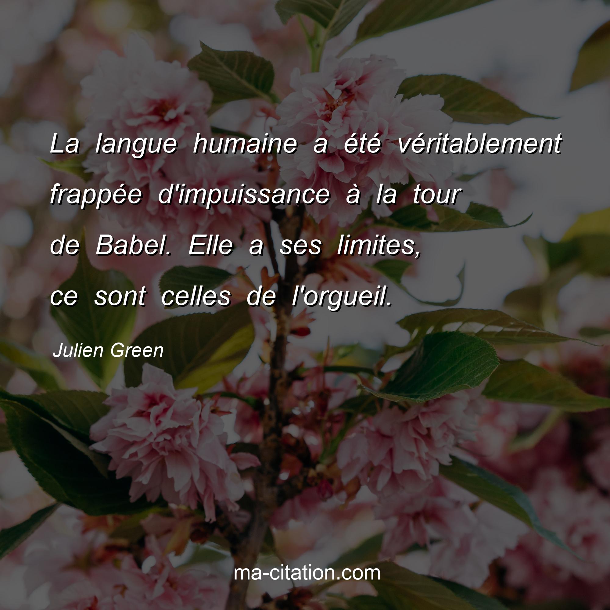 Citation sur la vie de Julien Green :La langue humaine a été véritablement frappée d'impuissance à la tour de Babel. Elle a ses limites, ce sont celles de l'orgueil.