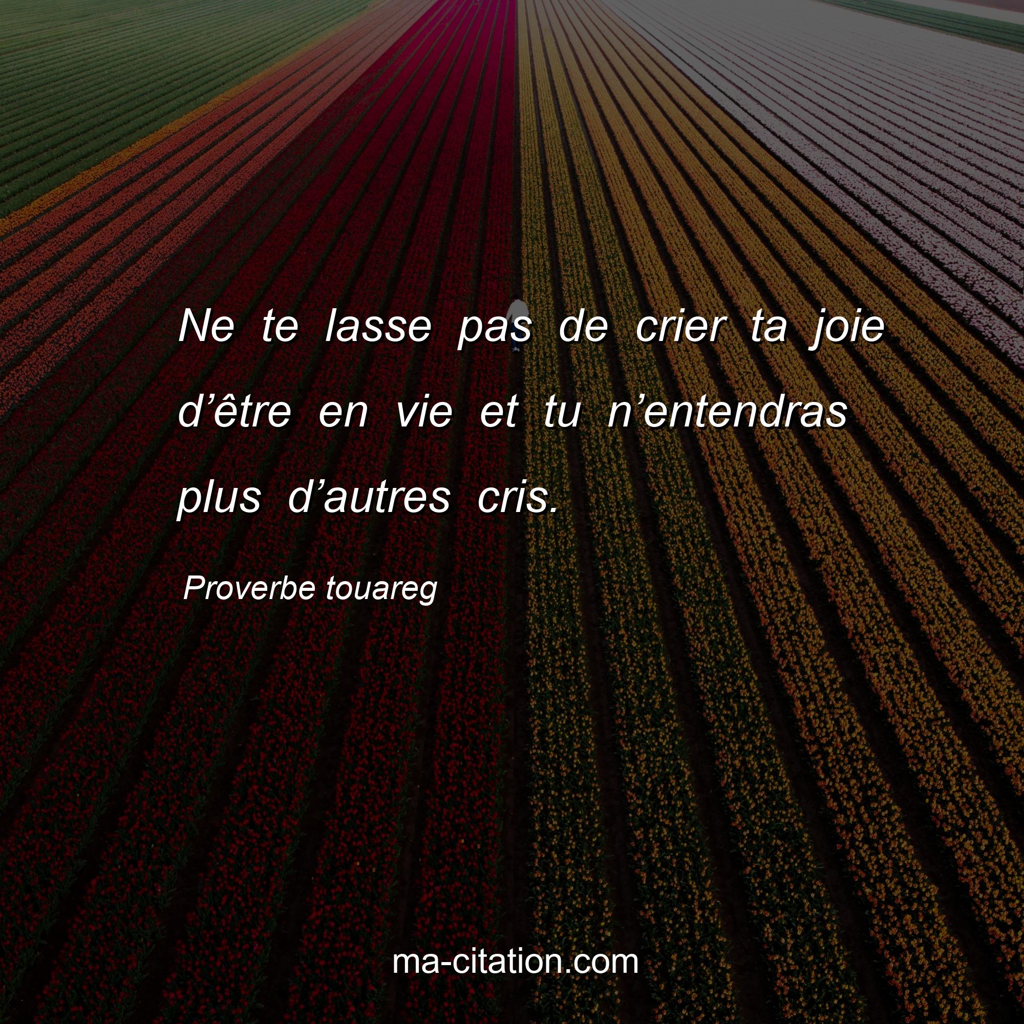 Proverbe touareg sur la vie :Ne te lasse pas de crier ta joie d’être en vie et tu n’entendras plus d’autres cris.