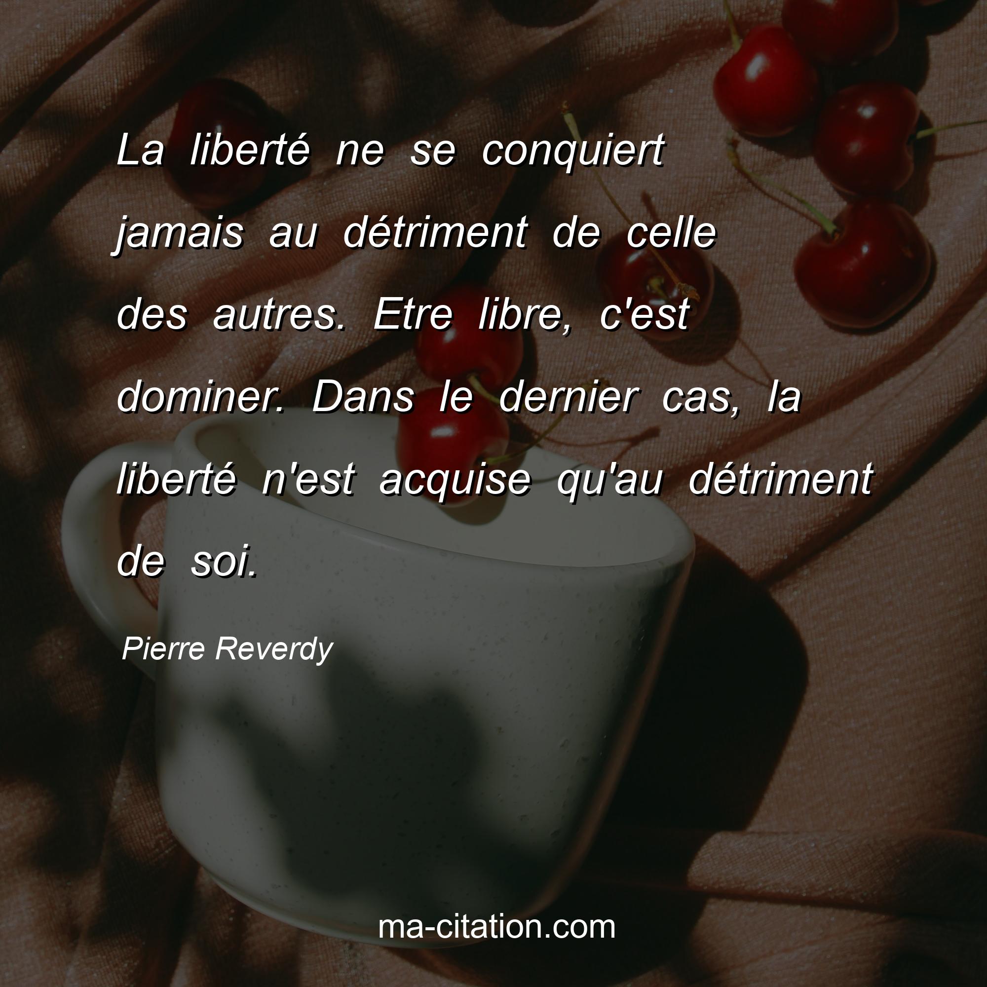 Citation sur la vie de Pierre Reverdy :La liberté ne se conquiert jamais au détriment de celle des autres. Etre libre, c'est dominer. Dans le dernier cas, la liberté n'est acquise qu'au détriment de soi.