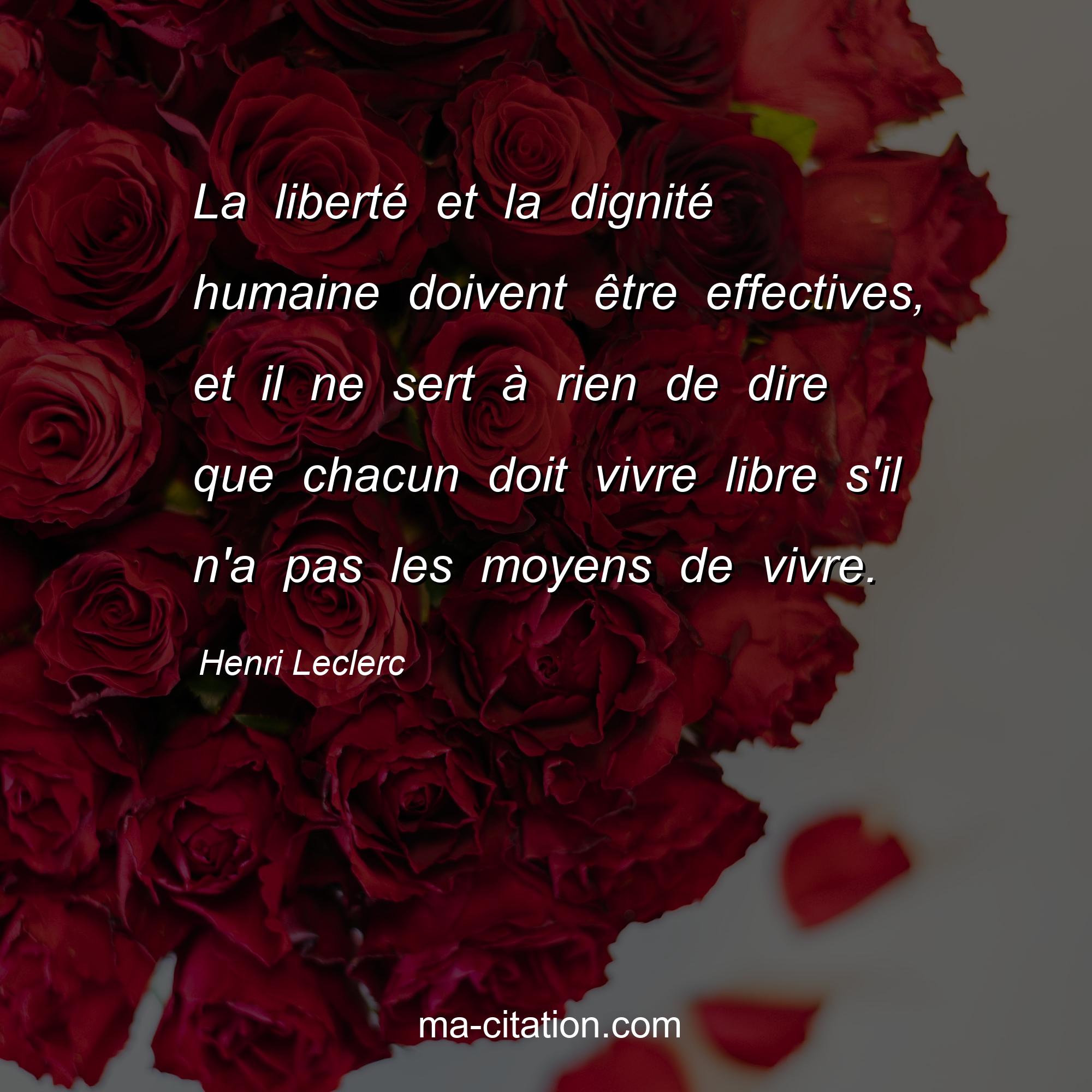 Citation sur la vie de Henri Leclerc :La liberté et la dignité humaine doivent être effectives, et il ne sert à rien de dire que chacun doit vivre libre s'il n'a pas les moyens de vivre.