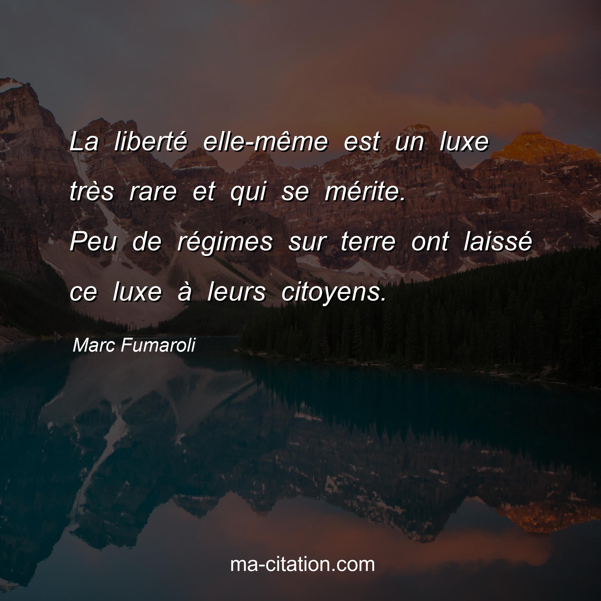 Citation sur la vie de Marc Fumaroli :La liberté elle-même est un luxe très rare et qui se mérite. Peu de régimes sur terre ont laissé ce luxe à leurs citoyens.