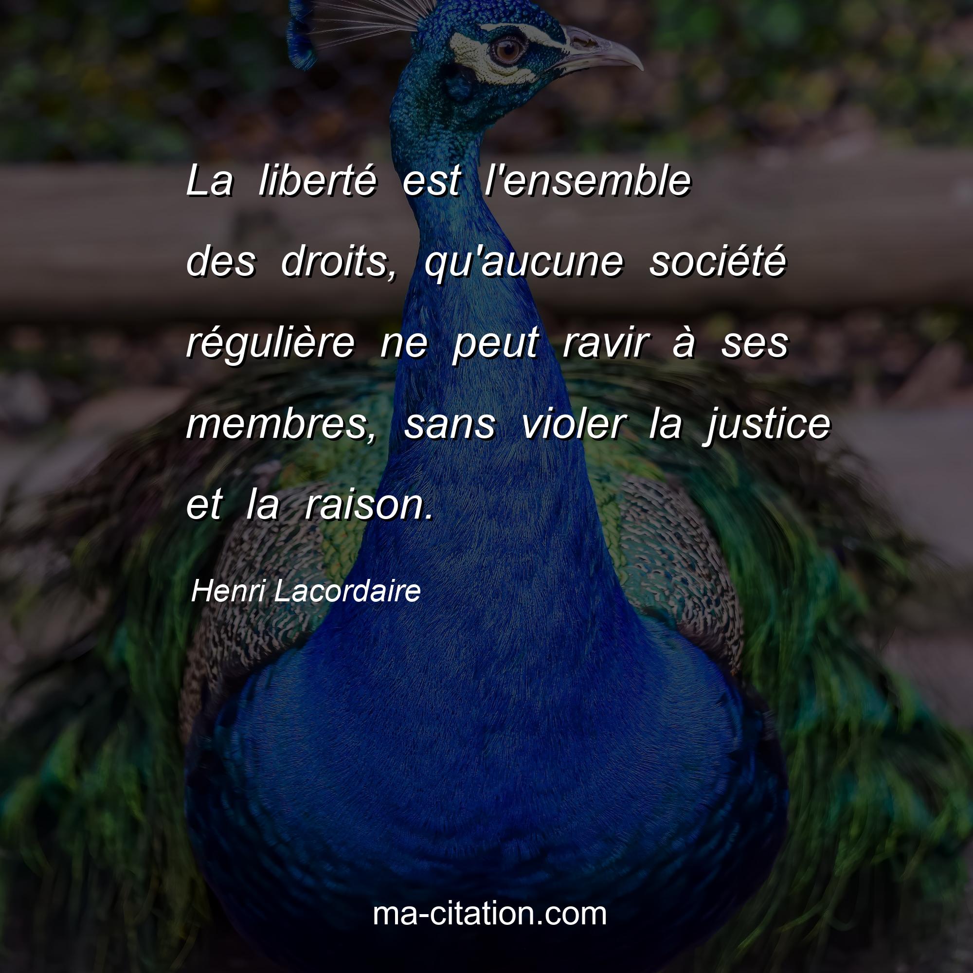 Citation sur la vie de Henri Lacordaire :La liberté est l'ensemble des droits, qu'aucune société régulière ne peut ravir à ses membres, sans violer la justice et la raison.