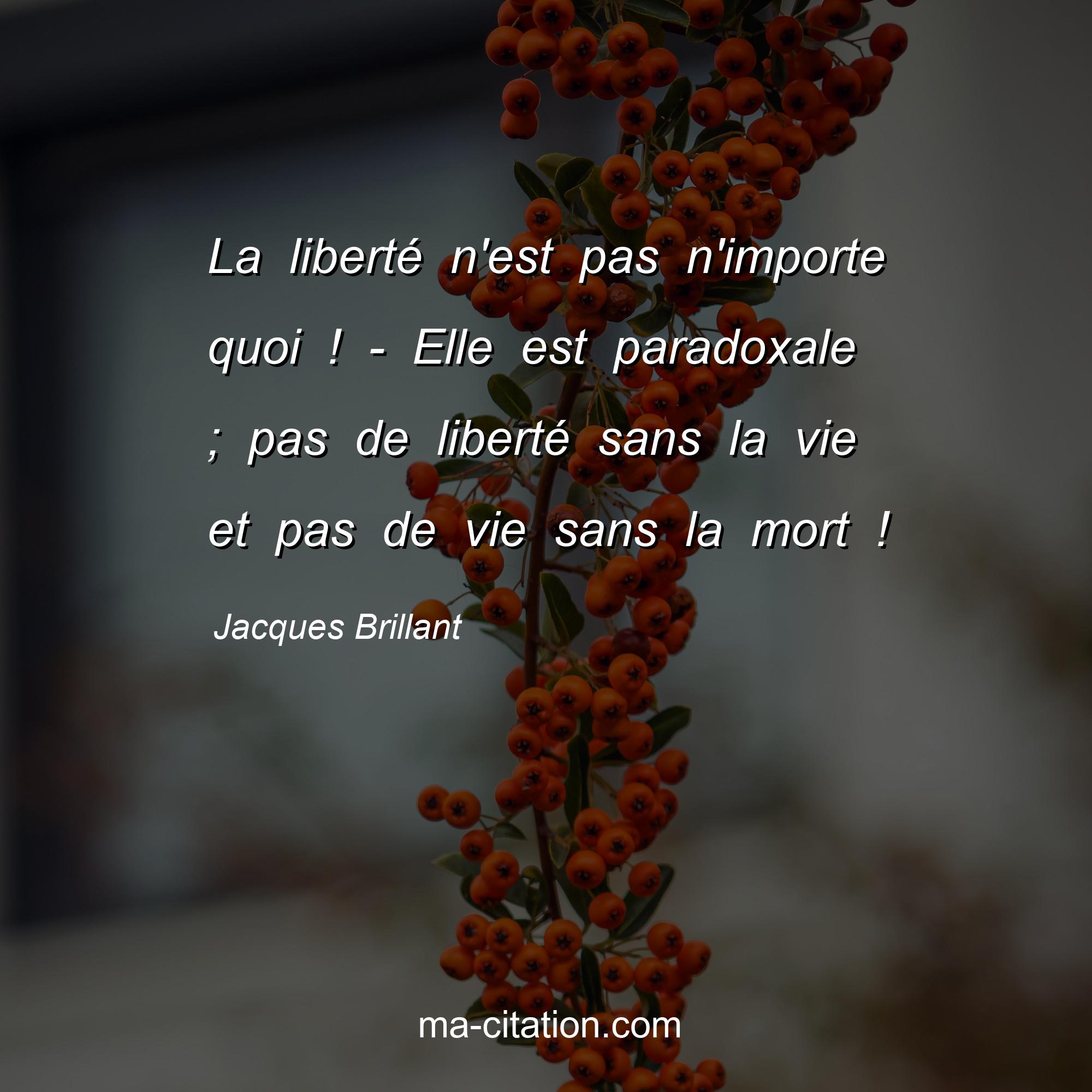 Citation sur la vie de Jacques Brillant :La liberté n'est pas n'importe quoi ! - Elle est paradoxale ; pas de liberté sans la vie et pas de vie sans la mort !