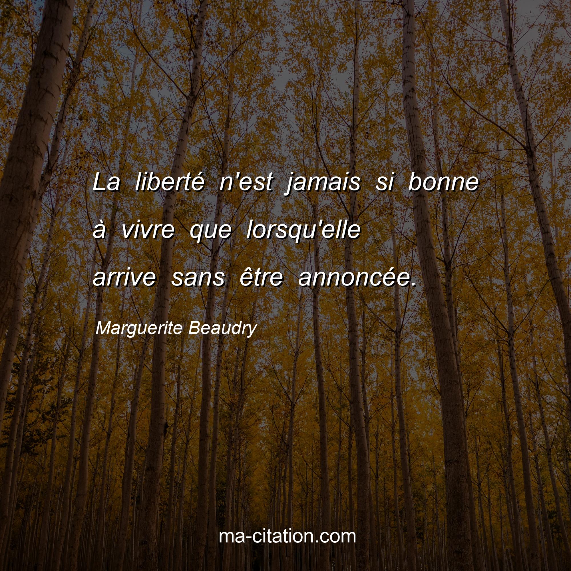 Marguerite Beaudry est l'auteur de la citation sur la vie "La liberté n'est jamais si bonne à vivre que lorsqu'elle arrive sans être annoncée.".