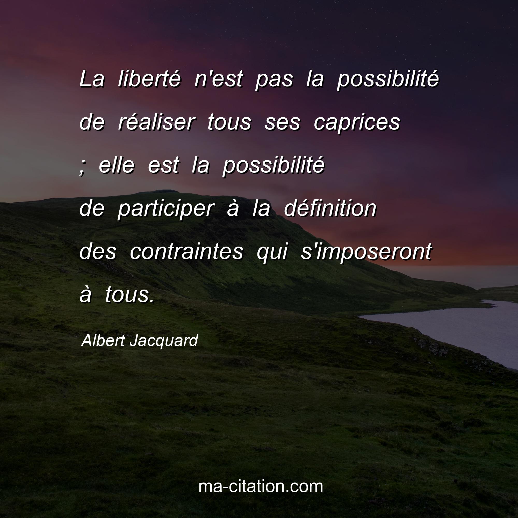 Citation sur la vie d'Albert Jacquard :La liberté n'est pas la possibilité de réaliser tous ses caprices ; elle est la possibilité de participer à la définition des contraintes qui s'imposeront à tous.