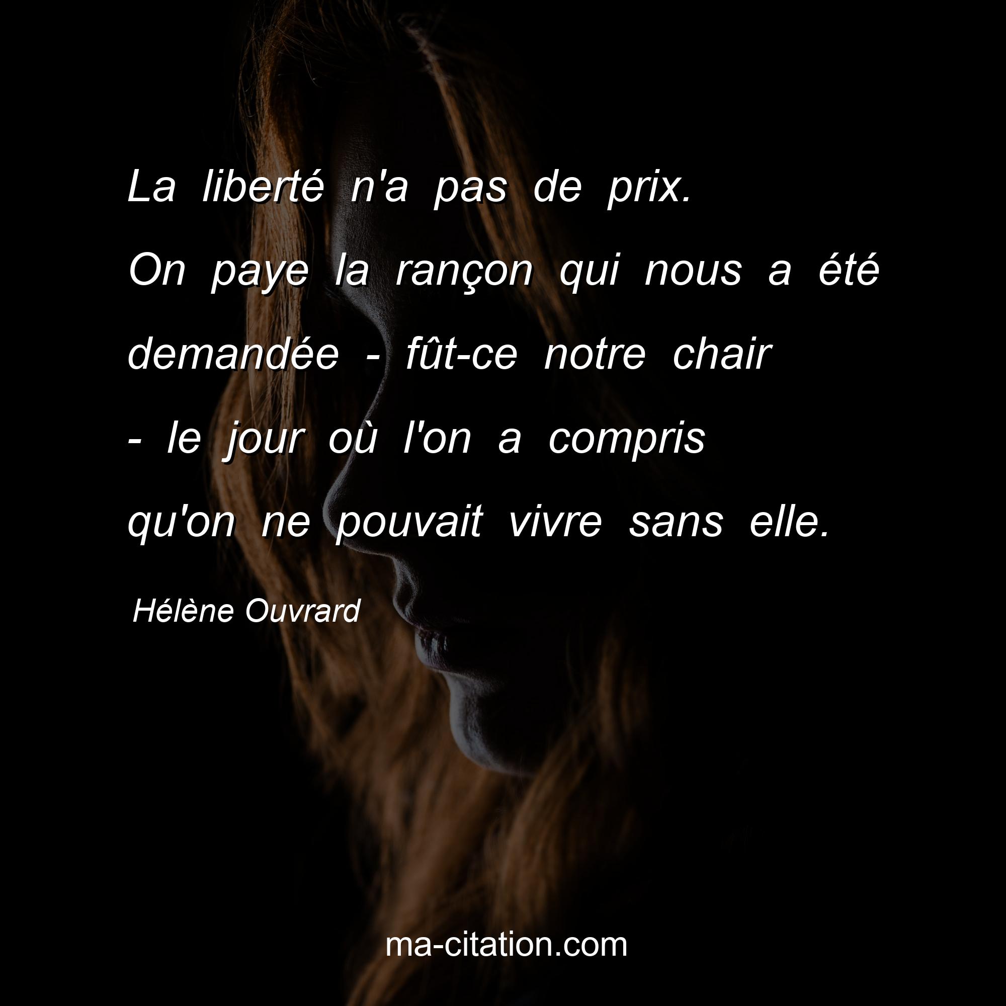 Hélène Ouvrard est l'auteur de la citation sur la vie "La liberté n'a pas de prix. On paye la rançon qui nous a été demandée - fût-ce notre chair - le jour où l'on a compris qu'on ne pouvait vivre sans elle.".
