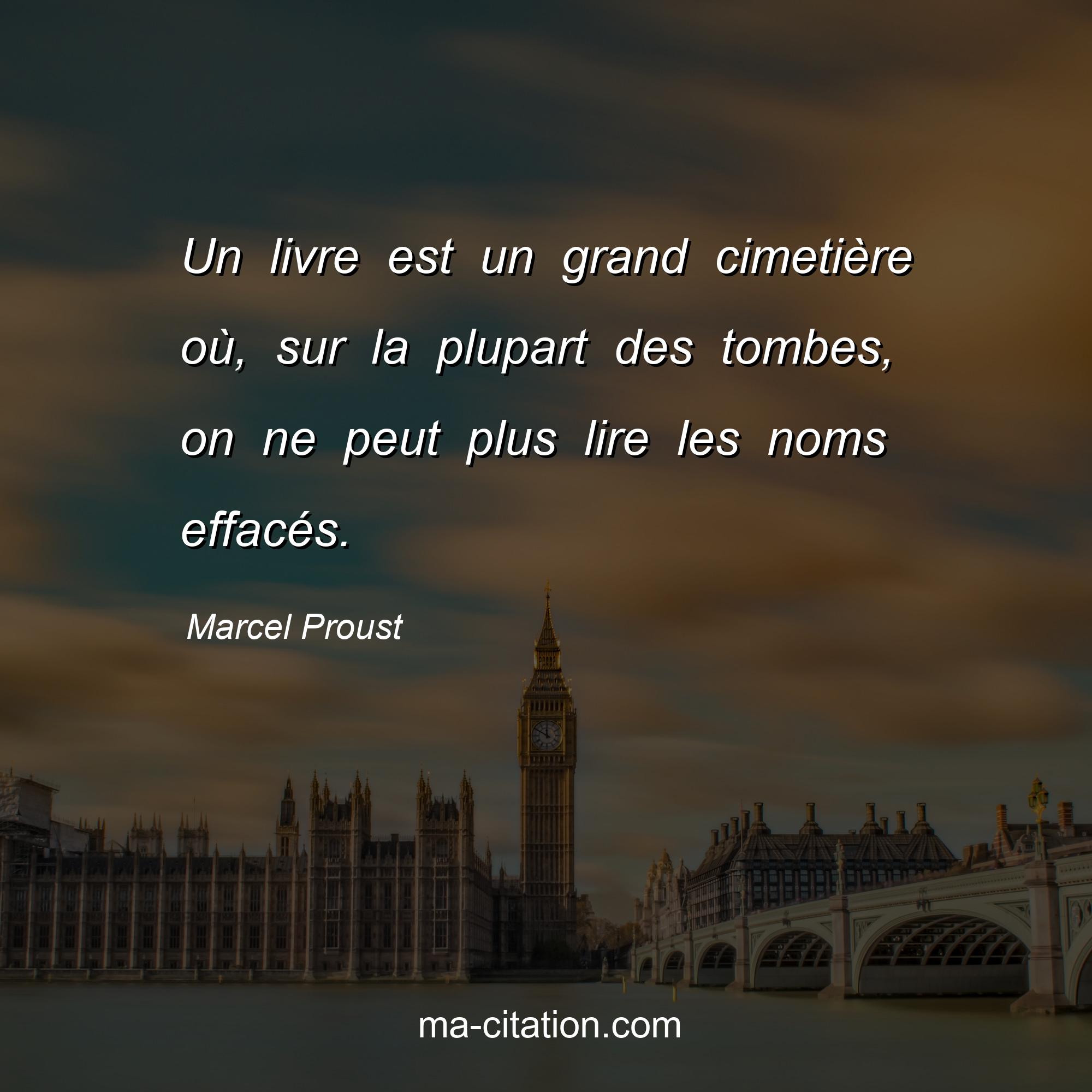 Citation sur la vie de Marcel Proust :Un livre est un grand cimetière où, sur la plupart des tombes, on ne peut plus lire les noms effacés.