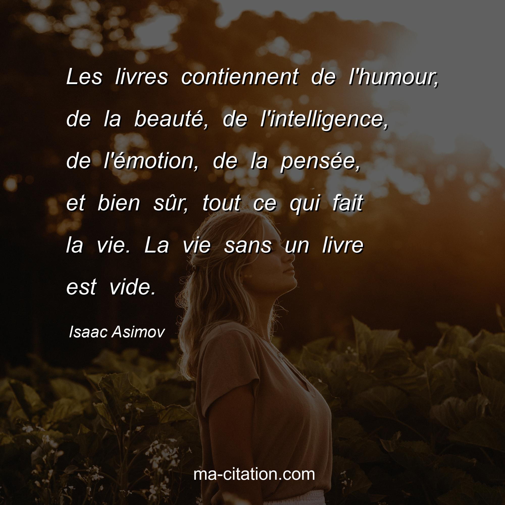 Citation sur la vie d'Isaac Asimov :Les livres contiennent de l'humour, de la beauté, de l'intelligence, de l'émotion, de la pensée, et bien sûr, tout ce qui fait la vie. La vie sans un livre est vide.
