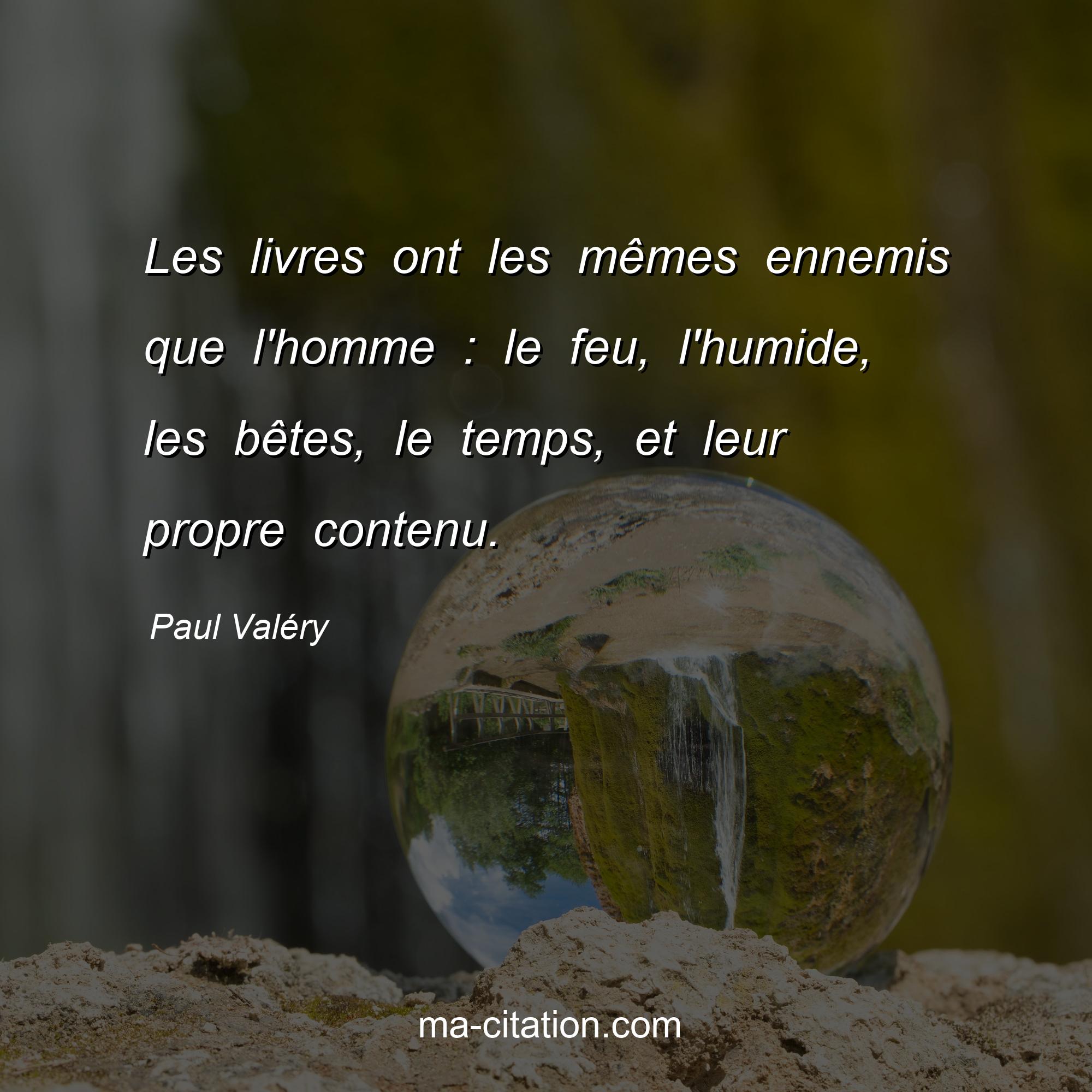 Citation sur la vie de Paul Valéry :Les livres ont les mêmes ennemis que l'homme : le feu, l'humide, les bêtes, le temps, et leur propre contenu.