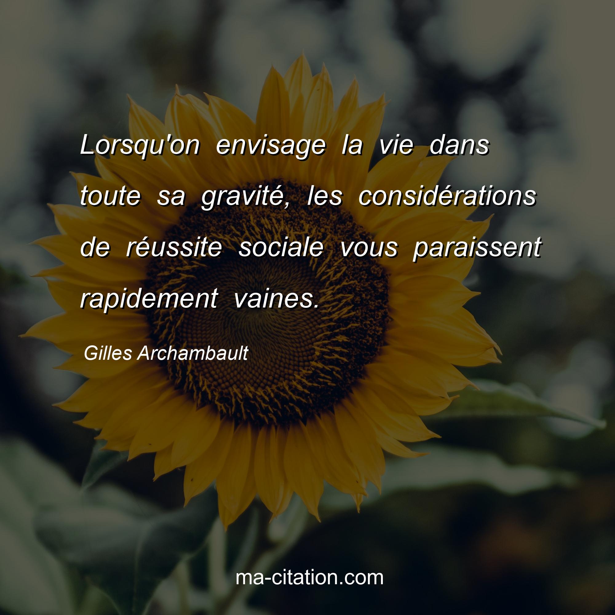 Gilles Archambault est l'auteur de la citation sur la vie "Lorsqu'on envisage la vie dans toute sa gravité, les considérations de réussite sociale vous paraissent rapidement vaines.".