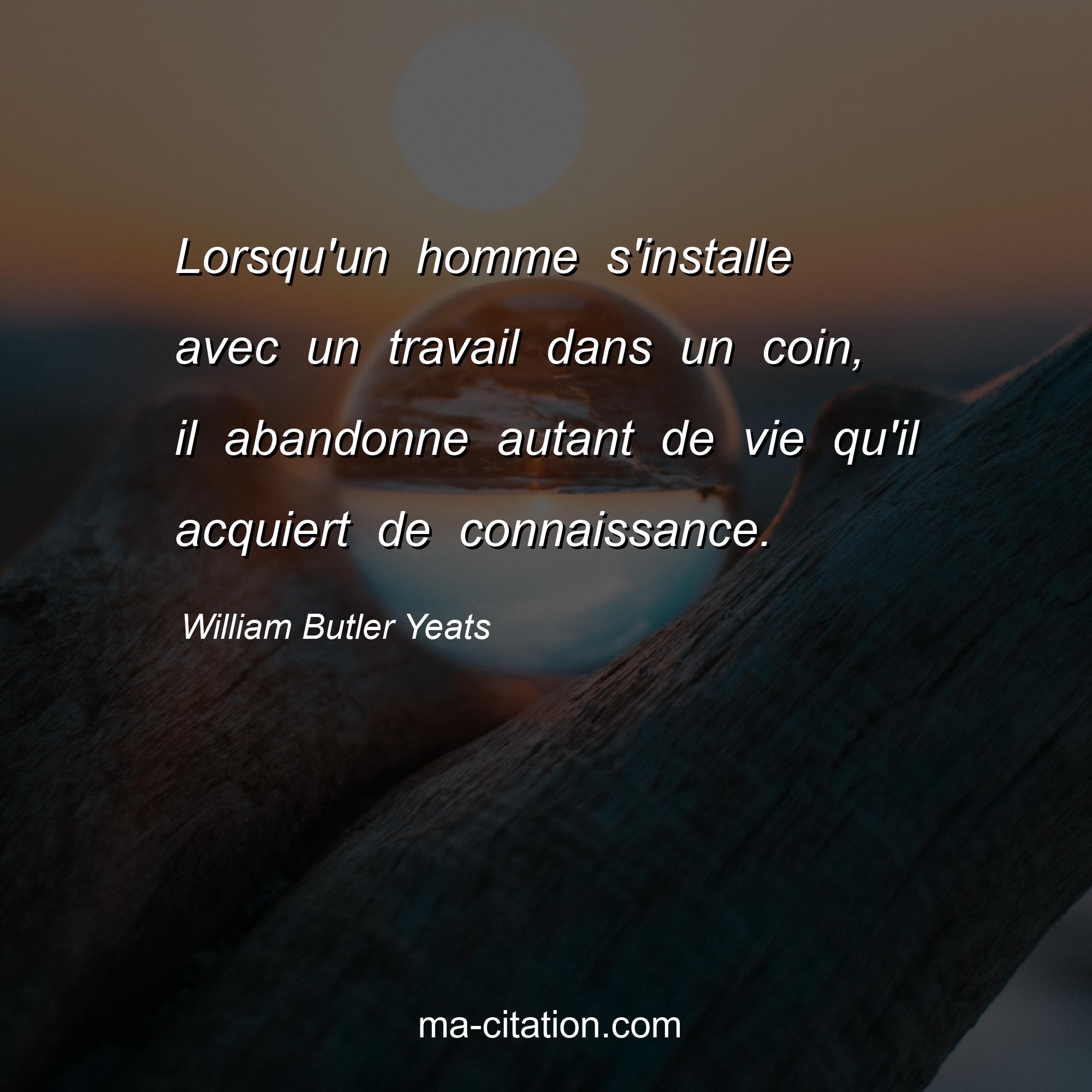 Citation sur la vie de William Butler Yeats :Lorsqu'un homme s'installe avec un travail dans un coin, il abandonne autant de vie qu'il acquiert de connaissance.