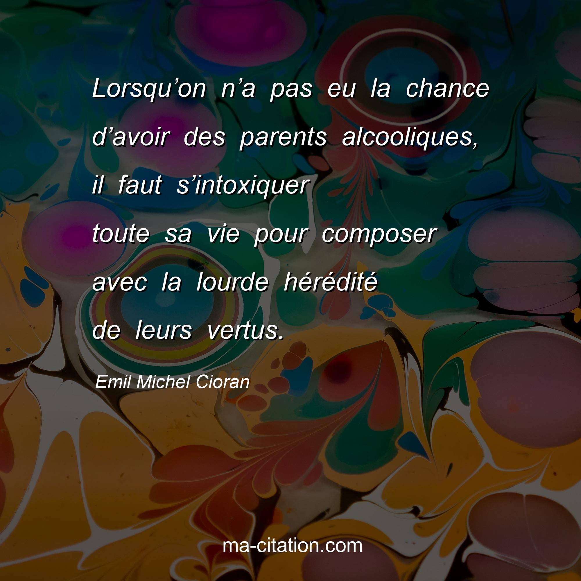 Citation sur la vie d'Emil Michel Cioran :Lorsqu’on n’a pas eu la chance d’avoir des parents alcooliques, il faut s’intoxiquer toute sa vie pour composer avec la lourde hérédité de leurs vertus.