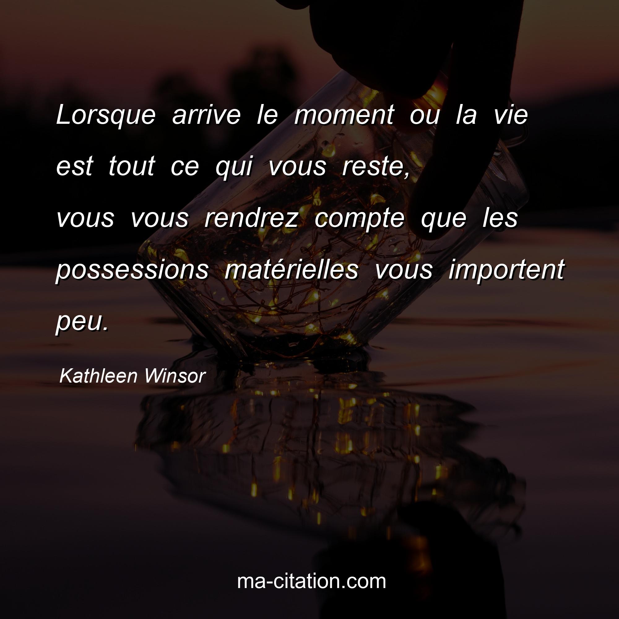 Kathleen Winsor est l'auteur de la citation sur la vie "Lorsque arrive le moment ou la vie est tout ce qui vous reste, vous vous rendrez compte que les possessions matérielles vous importent peu.".