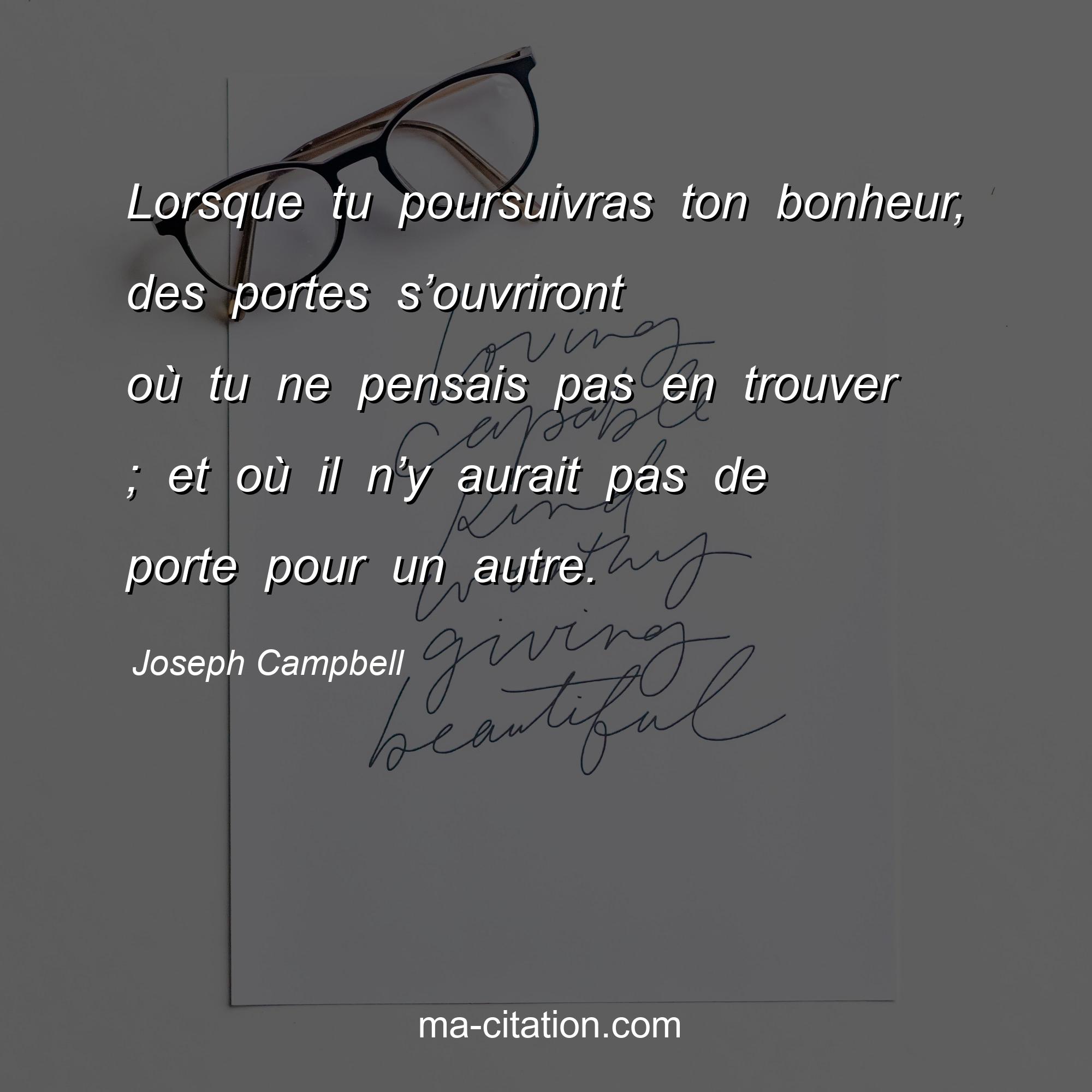 Citation sur la vie de Joseph Campbell :Lorsque tu poursuivras ton bonheur, des portes s’ouvriront où tu ne pensais pas en trouver ; et où il n’y aurait pas de porte pour un autre.