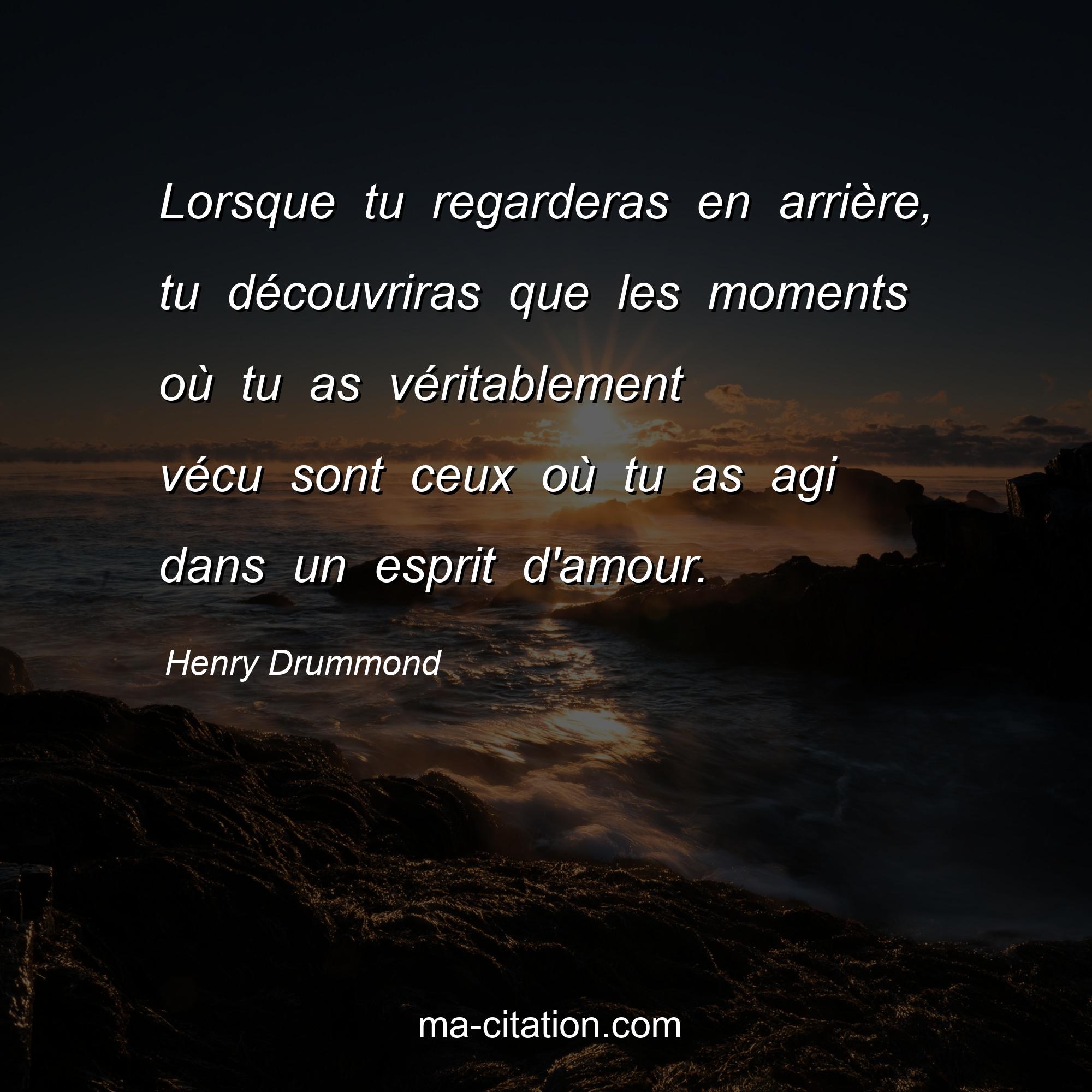 Citation sur la vie de Henry Drummond :Lorsque tu regarderas en arrière, tu découvriras que les moments où tu as véritablement vécu sont ceux où tu as agi dans un esprit d'amour.