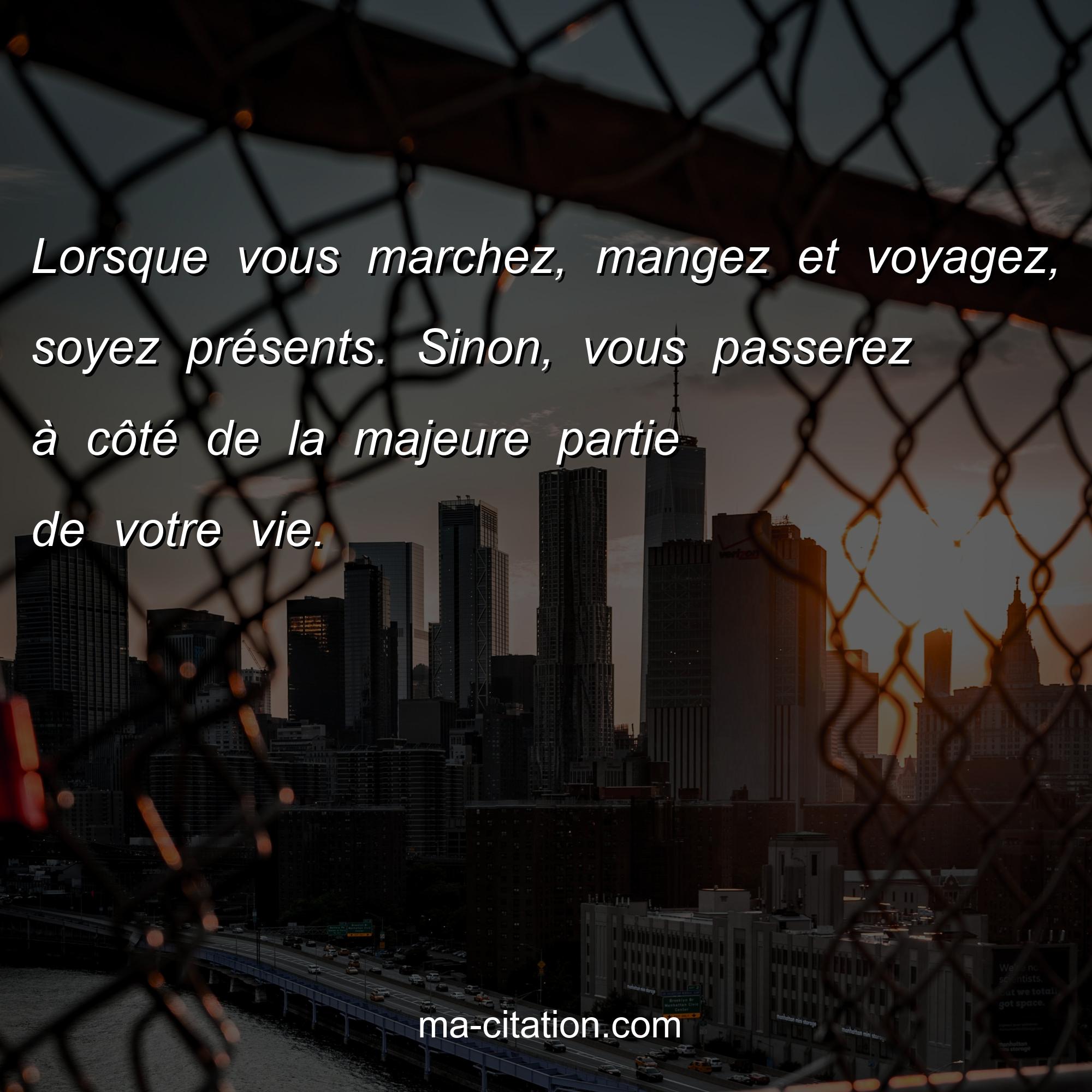 Citation sur la vie :Lorsque vous marchez, mangez et voyagez, soyez présents. Sinon, vous passerez à côté de la majeure partie de votre vie.