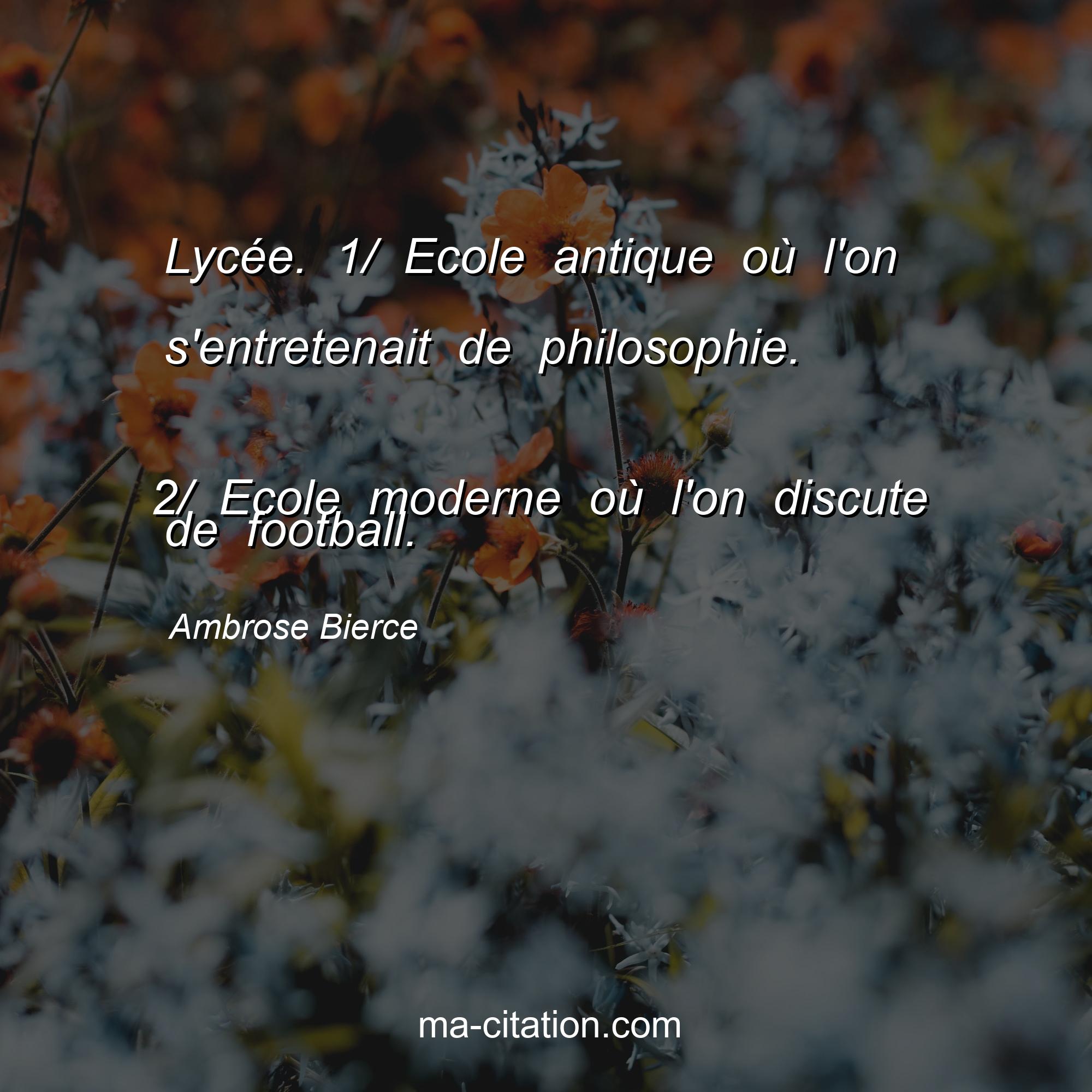 Citation sur la vie d'Ambrose Bierce :Lycée. 1/ Ecole antique où l'on s'entretenait de philosophie. 2/ Ecole moderne où l'on discute de football.