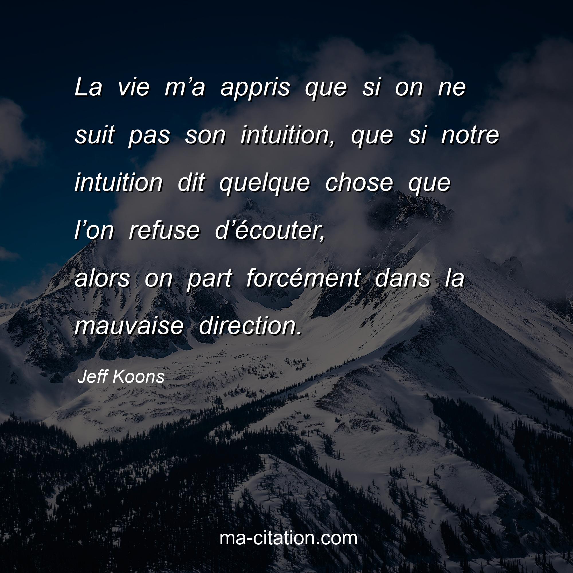 Citation sur la vie de Jeff Koons :La vie m’a appris que si on ne suit pas son intuition, que si notre intuition dit quelque chose que l’on refuse d’écouter, alors on part forcément dans la mauvaise direction.