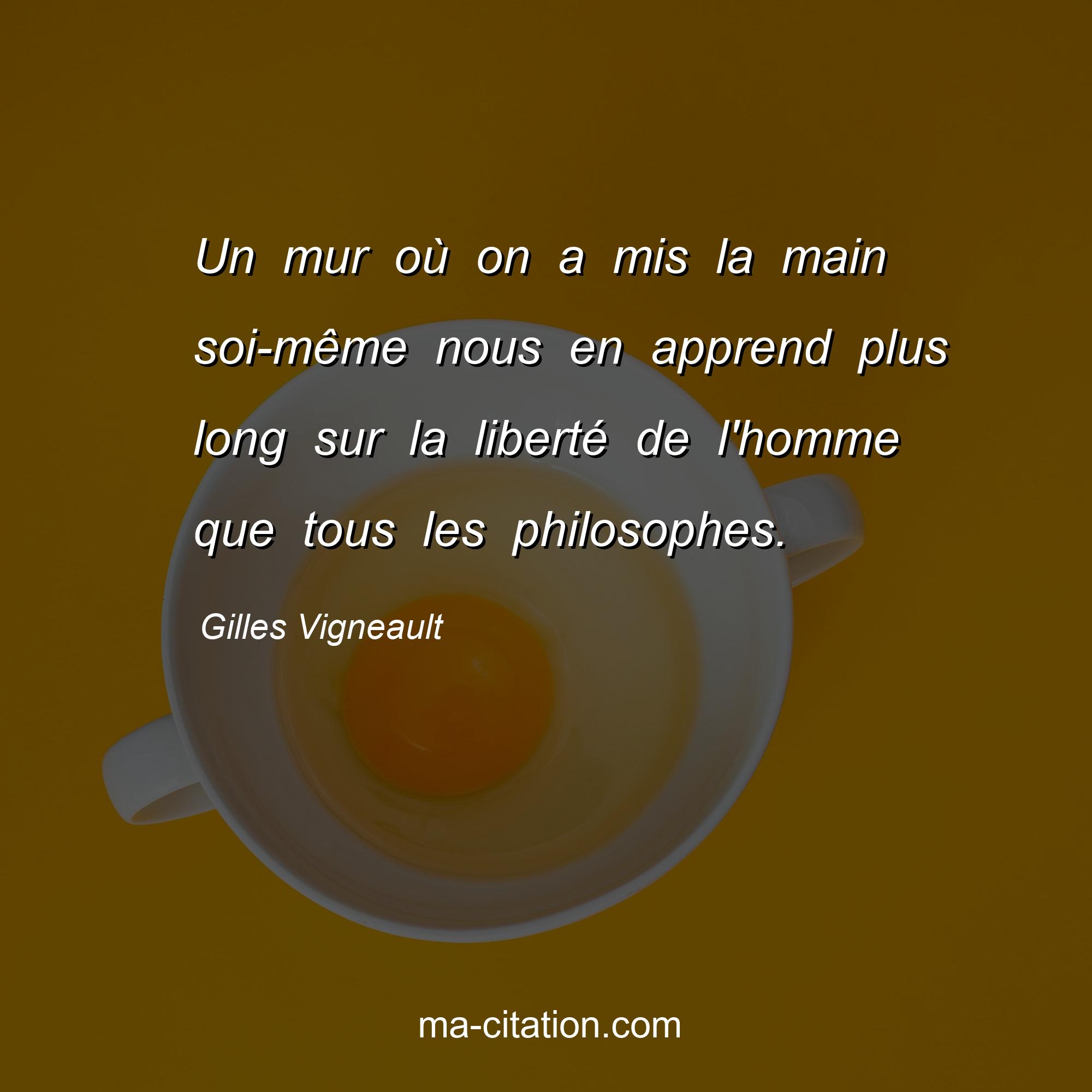 Citation sur la vie de Gilles Vigneault :Un mur où on a mis la main soi-même nous en apprend plus long sur la liberté de l'homme que tous les philosophes.