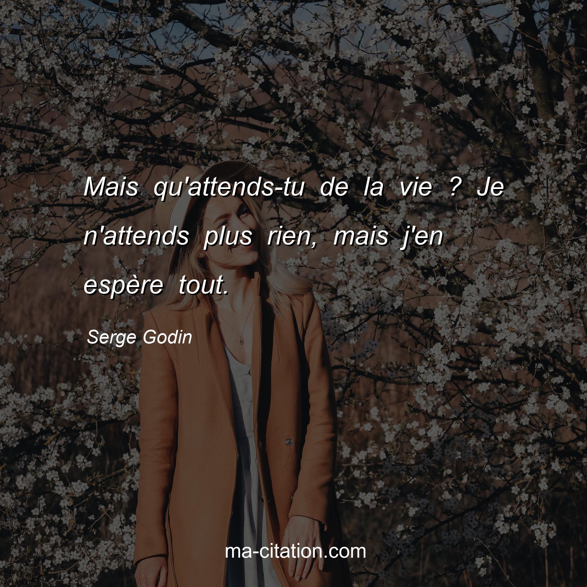 Serge Godin est l'auteur de la citation sur la vie "Mais qu'attends-tu de la vie ? Je n'attends plus rien, mais j'en espère tout.".