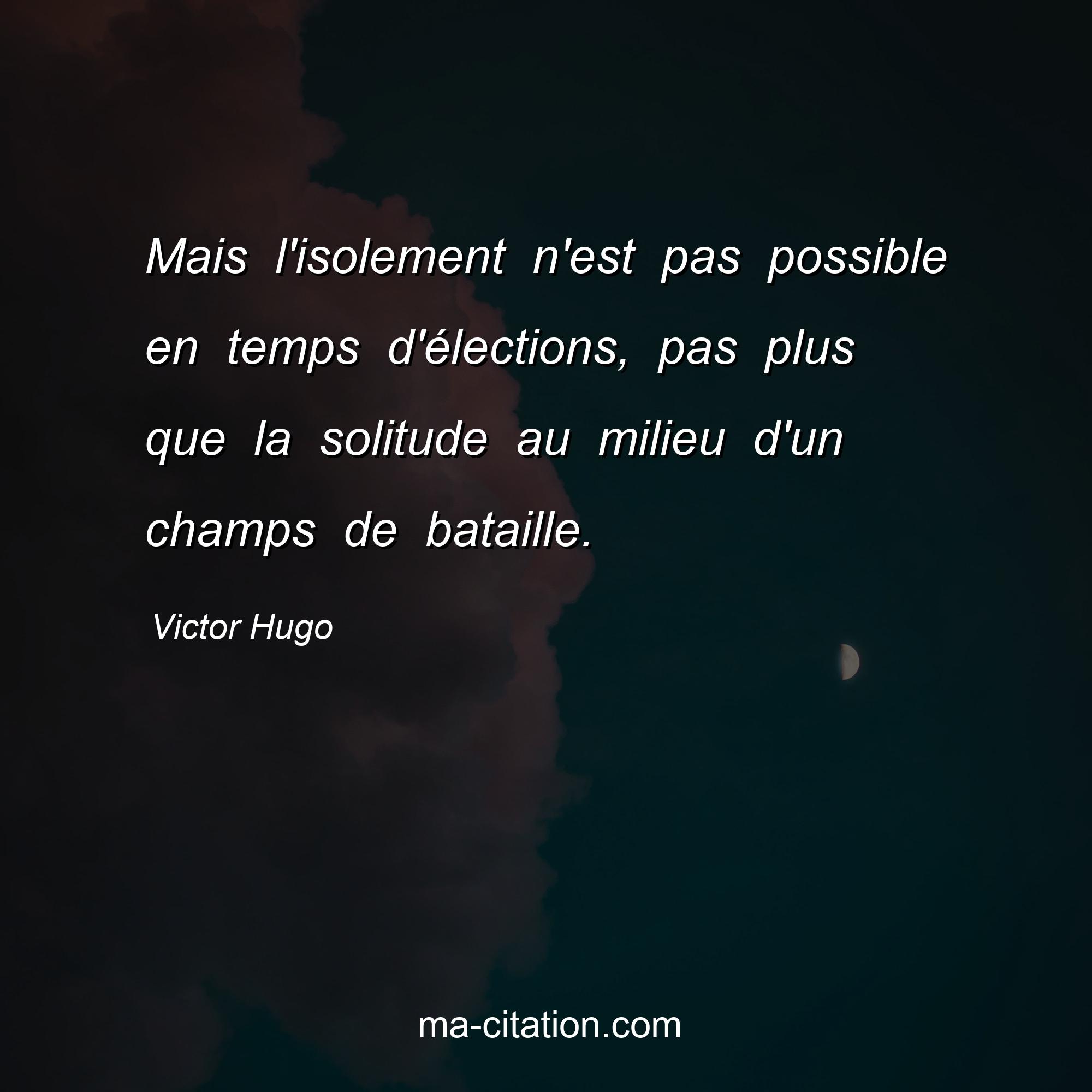Victor Hugo est l'auteur de la citation sur la vie "Mais l'isolement n'est pas possible en temps d'élections, pas plus que la solitude au milieu d'un champs de bataille.".