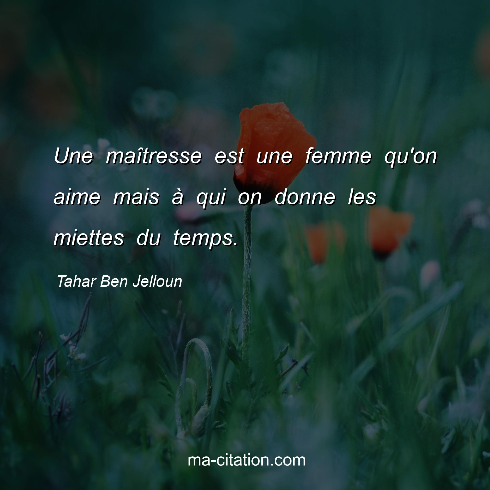 Citation sur la vie de Tahar Ben Jelloun :Une maîtresse est une femme qu'on aime mais à qui on donne les miettes du temps.