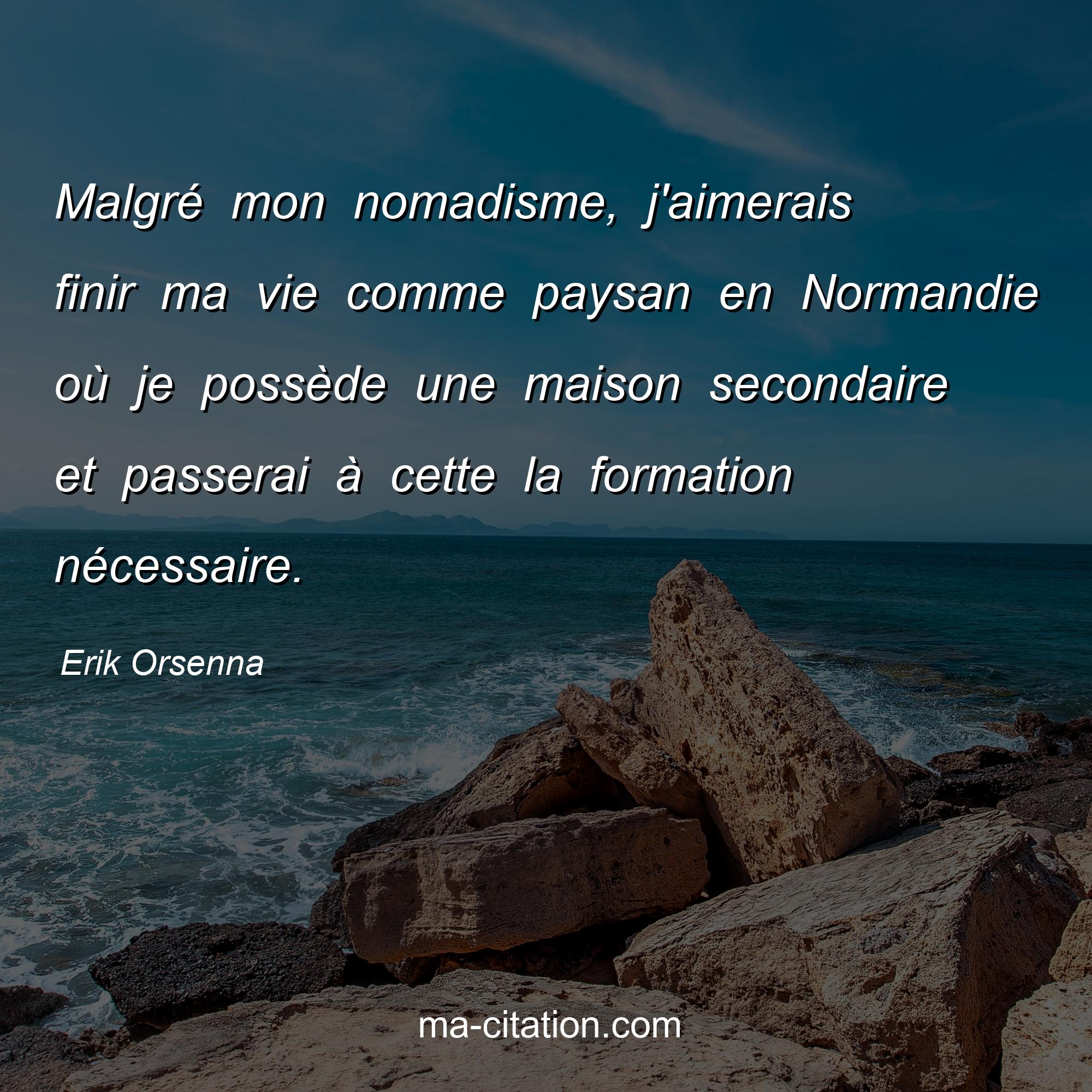 Citation sur la vie d'Erik Orsenna :Malgré mon nomadisme, j'aimerais finir ma vie comme paysan en Normandie où je possède une maison secondaire et passerai à cette la formation nécessaire.