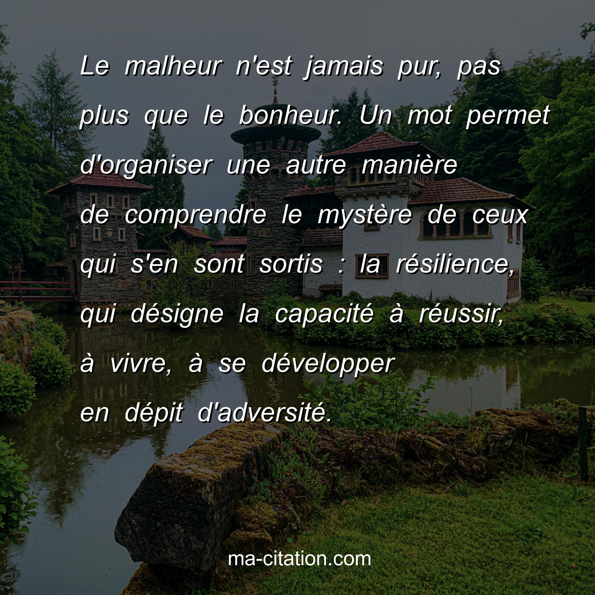 Boris Cyrulnik est l'auteur de la citation sur la vie "Le malheur n'est jamais pur, pas plus que le bonheur. Un mot permet d'organiser une autre manière de comprendre le mystère de ceux qui s'en sont sortis : la résilience, qui désigne la capacité à réussir, à vivre, à se développer en dépit d'adversité.".