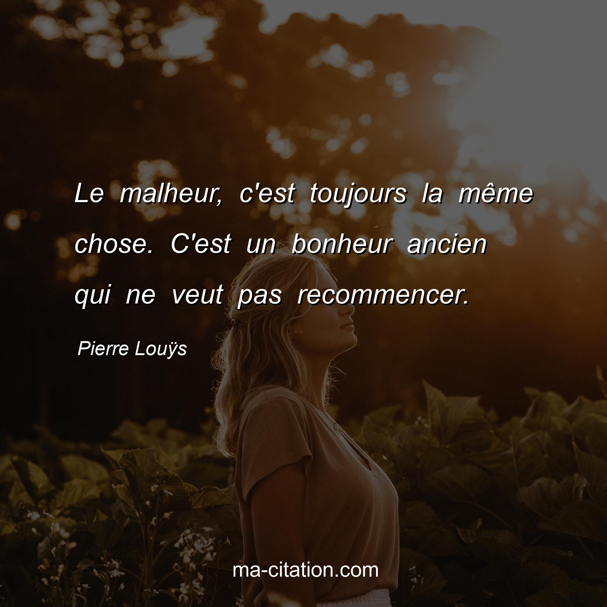 Citation sur la vie de Pierre Louÿs :Le malheur, c'est toujours la même chose. C'est un bonheur ancien qui ne veut pas recommencer.