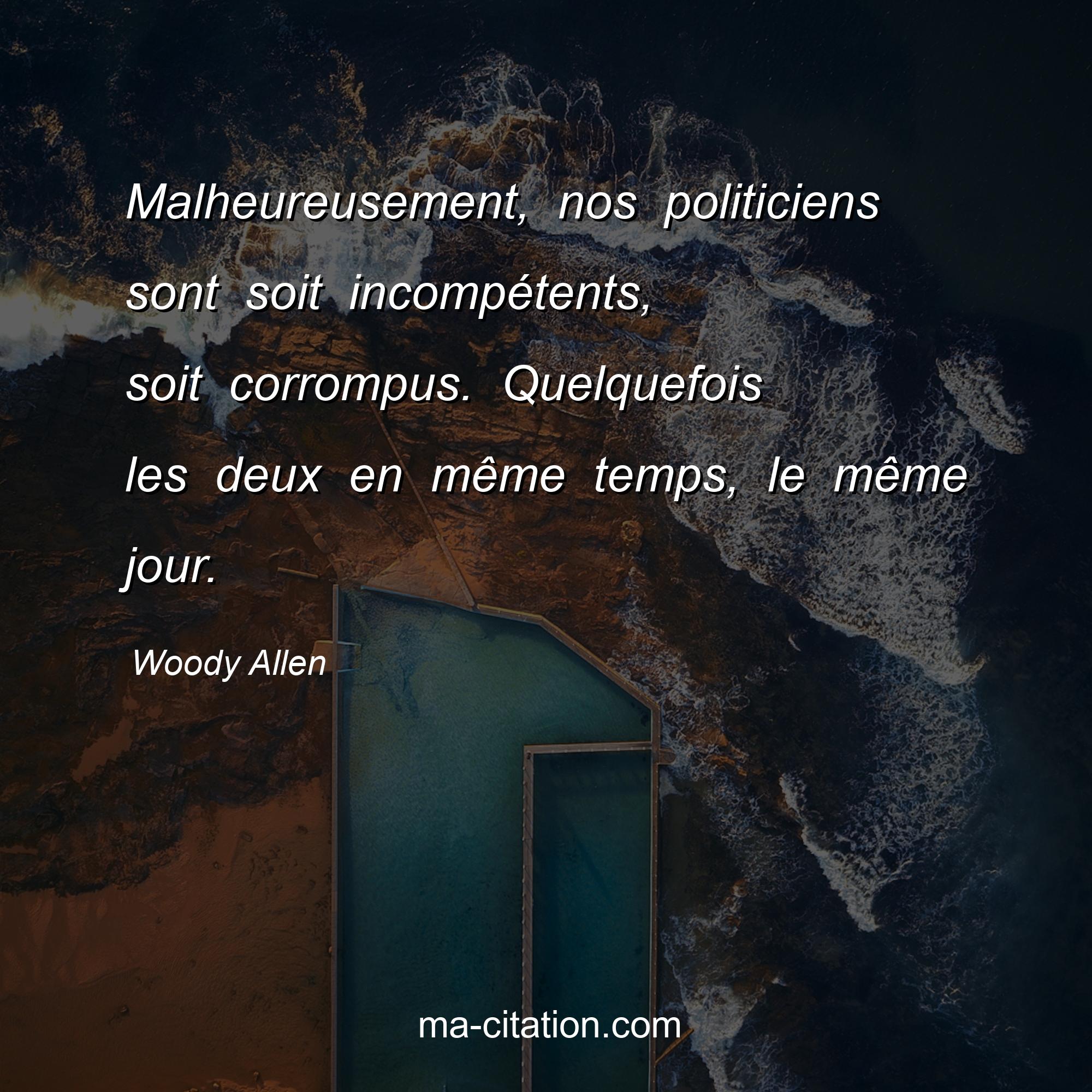 Citation sur la vie de Woody Allen :Malheureusement, nos politiciens sont soit incompétents, soit corrompus. Quelquefois les deux en même temps, le même jour.