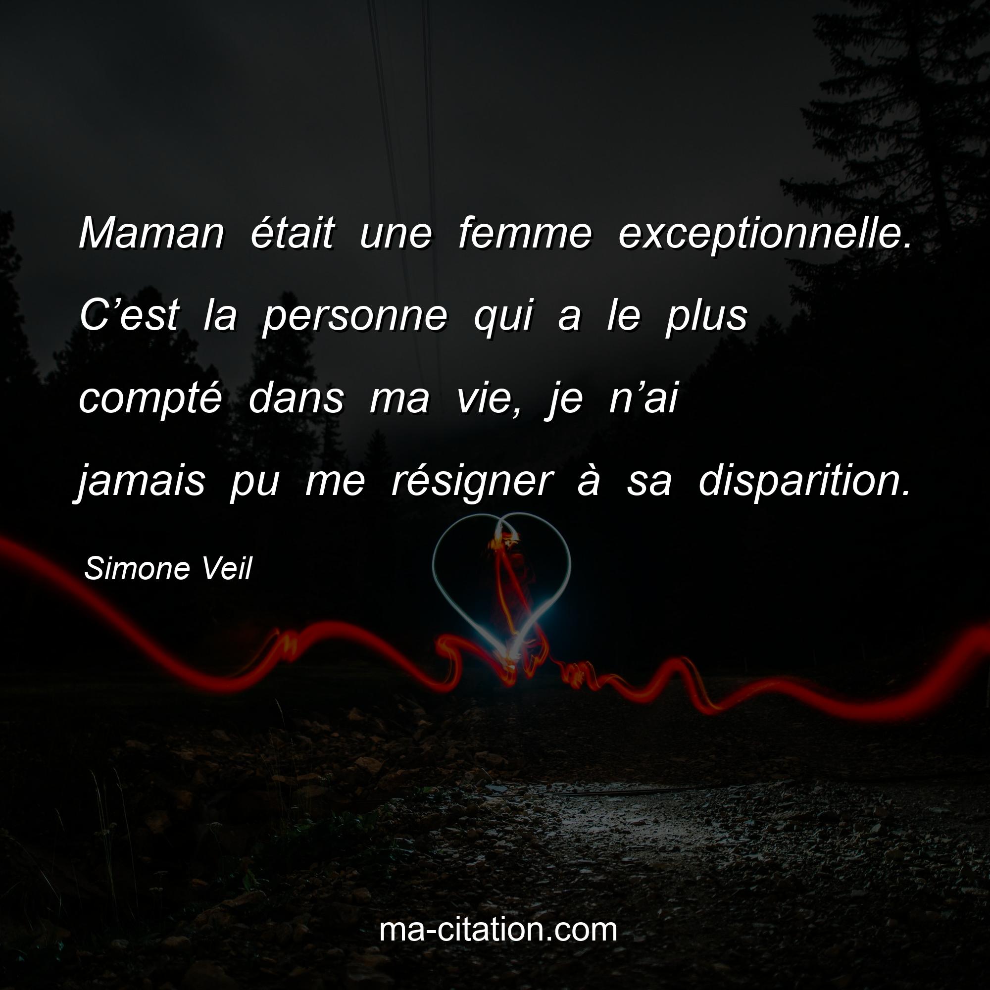 Simone Veil est l'auteur de la citation sur la vie "Maman était une femme exceptionnelle. C’est la personne qui a le plus compté dans ma vie, je n’ai jamais pu me résigner à sa disparition.".