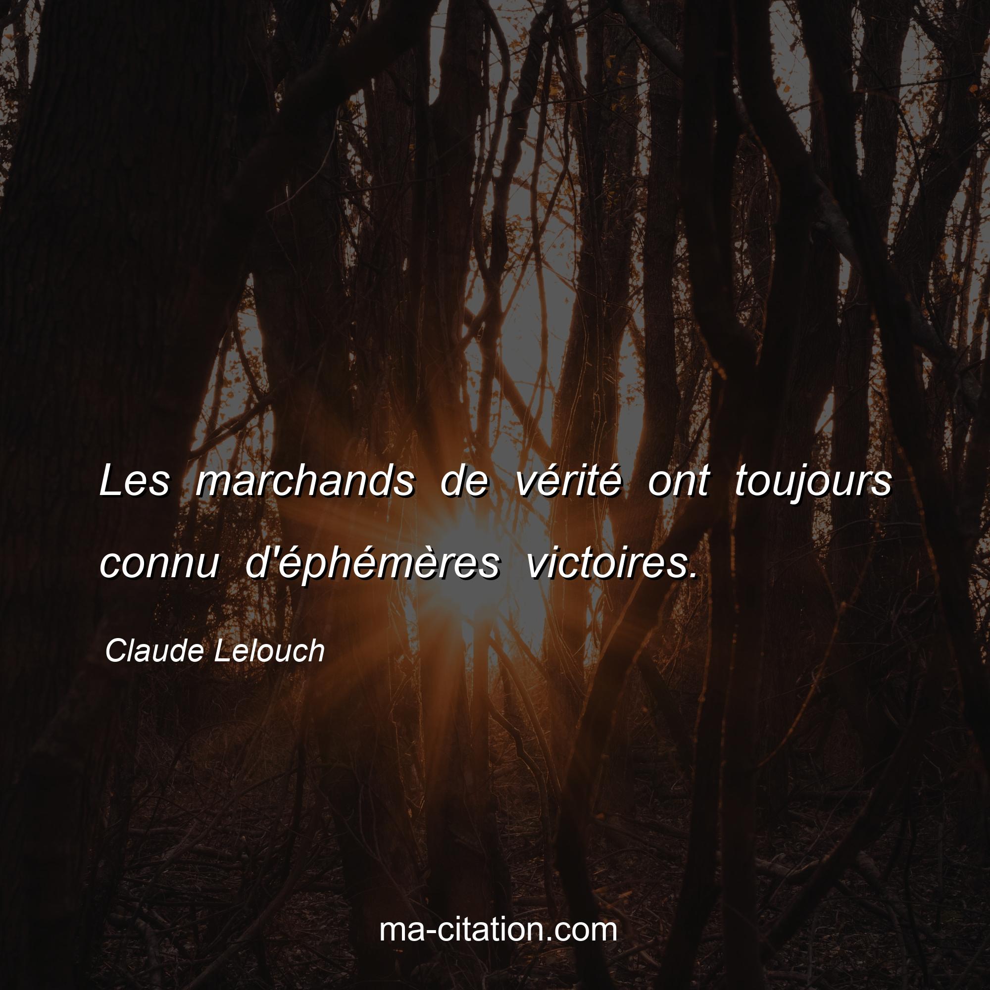 Citation sur la vie de Claude Lelouch :Les marchands de vérité ont toujours connu d'éphémères victoires.