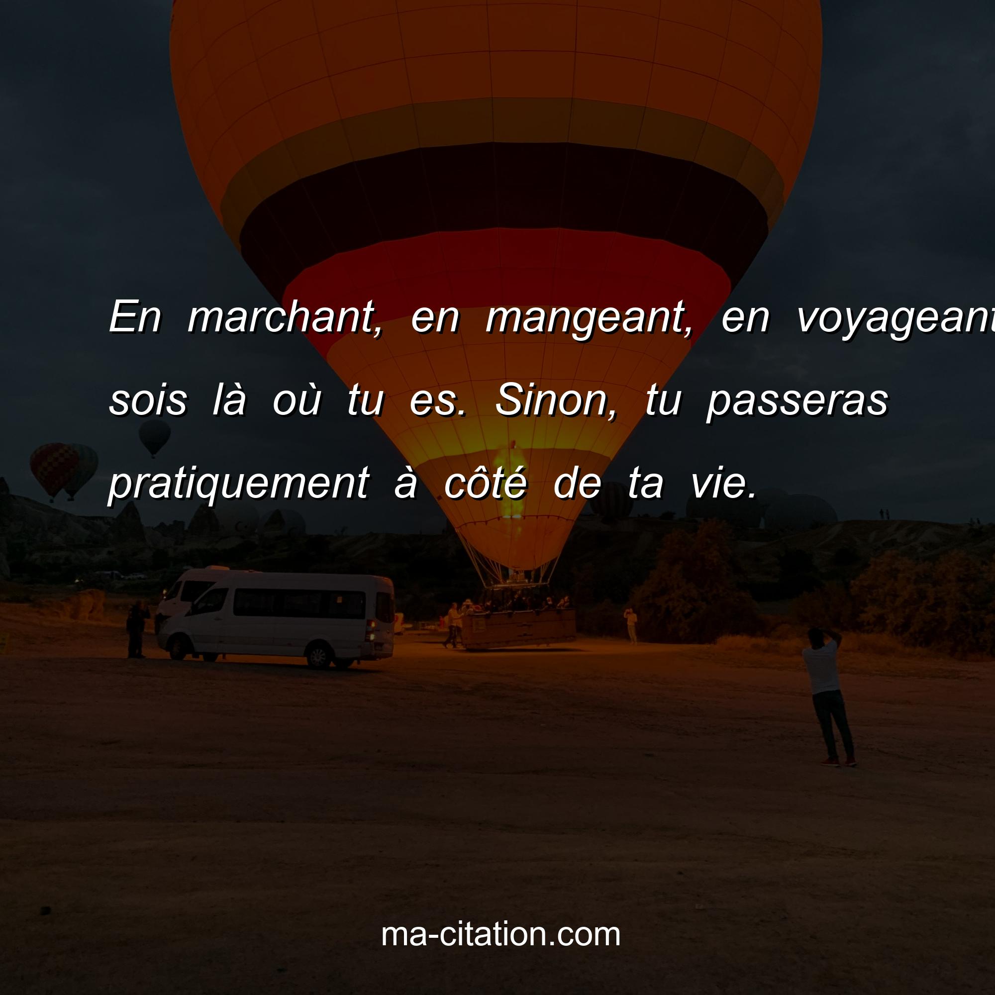 Citation sur la vie :En marchant, en mangeant, en voyageant, sois là où tu es. Sinon, tu passeras pratiquement à côté de ta vie.