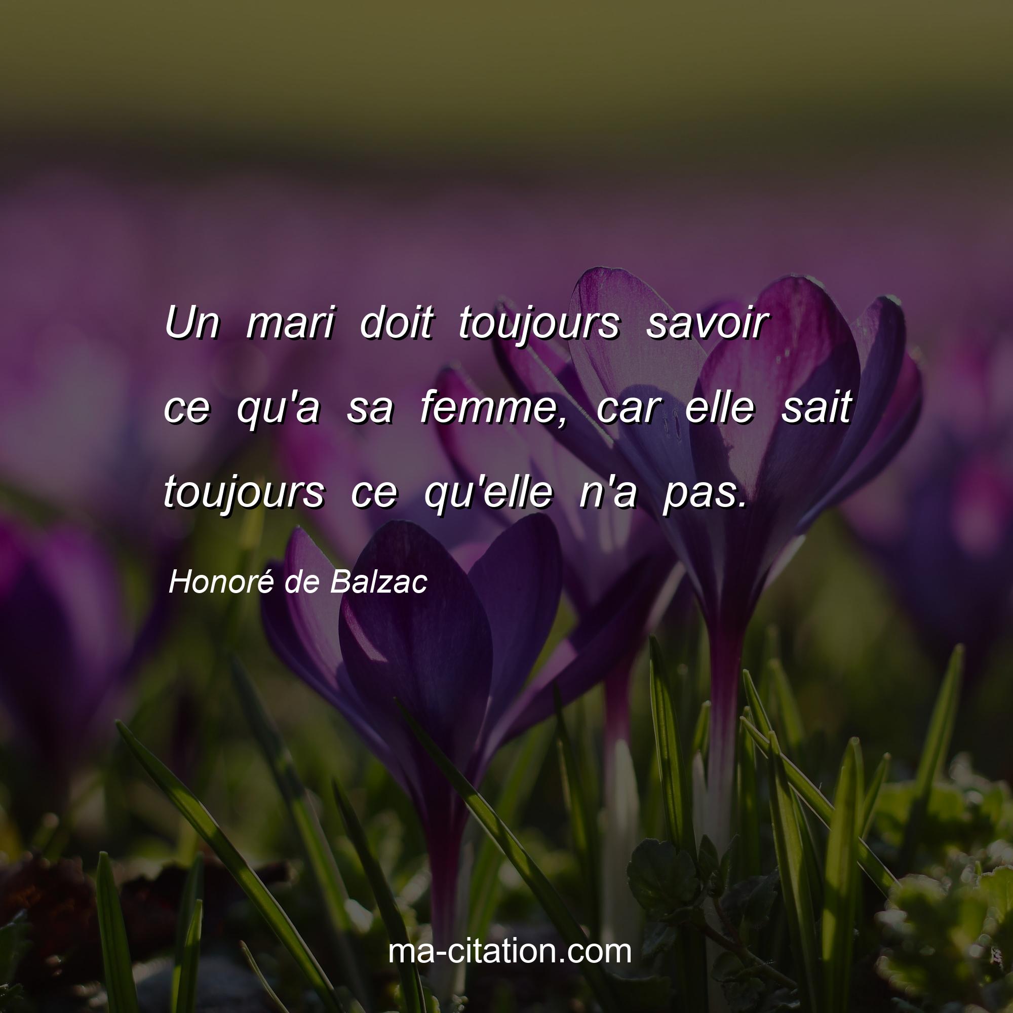 Citation sur la vie de Honoré de Balzac :Un mari doit toujours savoir ce qu'a sa femme, car elle sait toujours ce qu'elle n'a pas.
