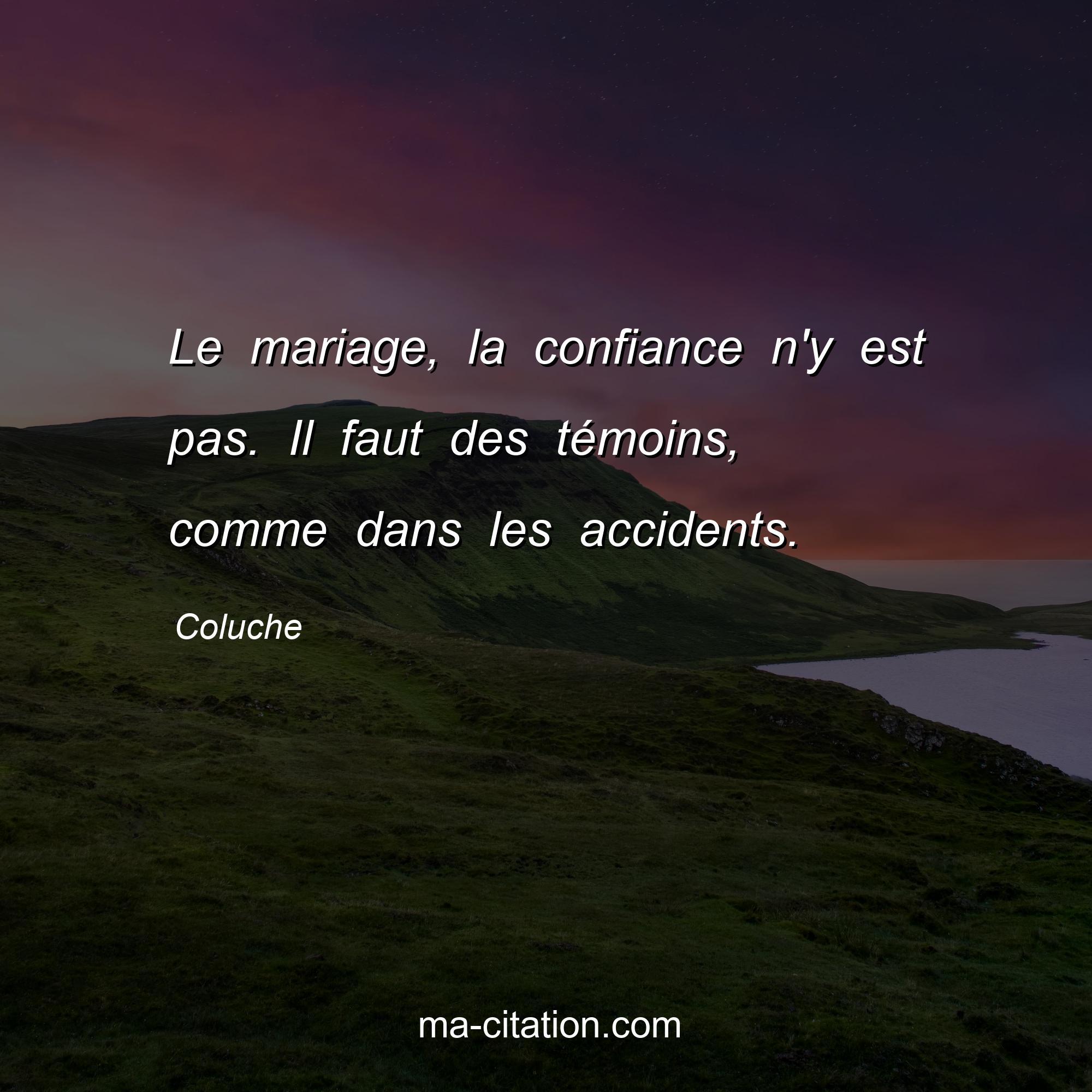 Citation sur la vie de Coluche :Le mariage, la confiance n'y est pas. Il faut des témoins, comme dans les accidents.
