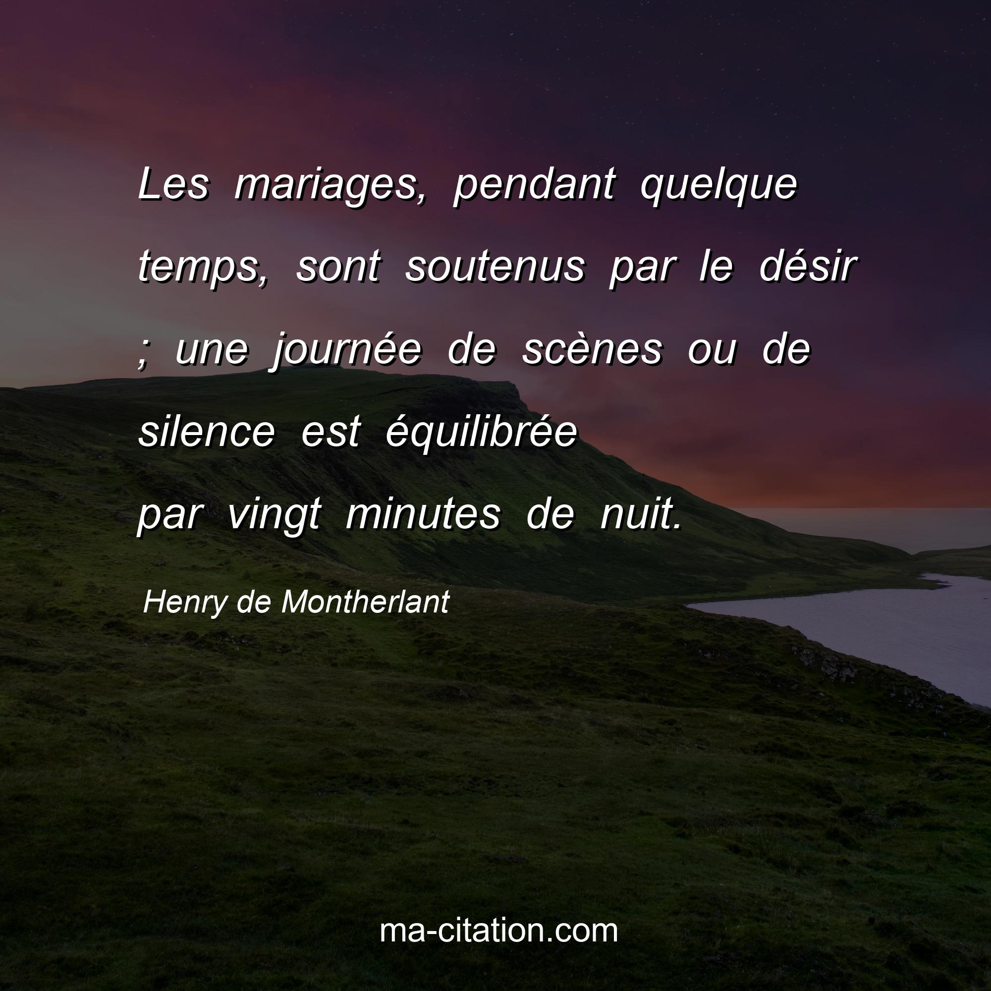 Citation sur la vie de Henry de Montherlant :Les mariages, pendant quelque temps, sont soutenus par le désir ; une journée de scènes ou de silence est équilibrée par vingt minutes de nuit.