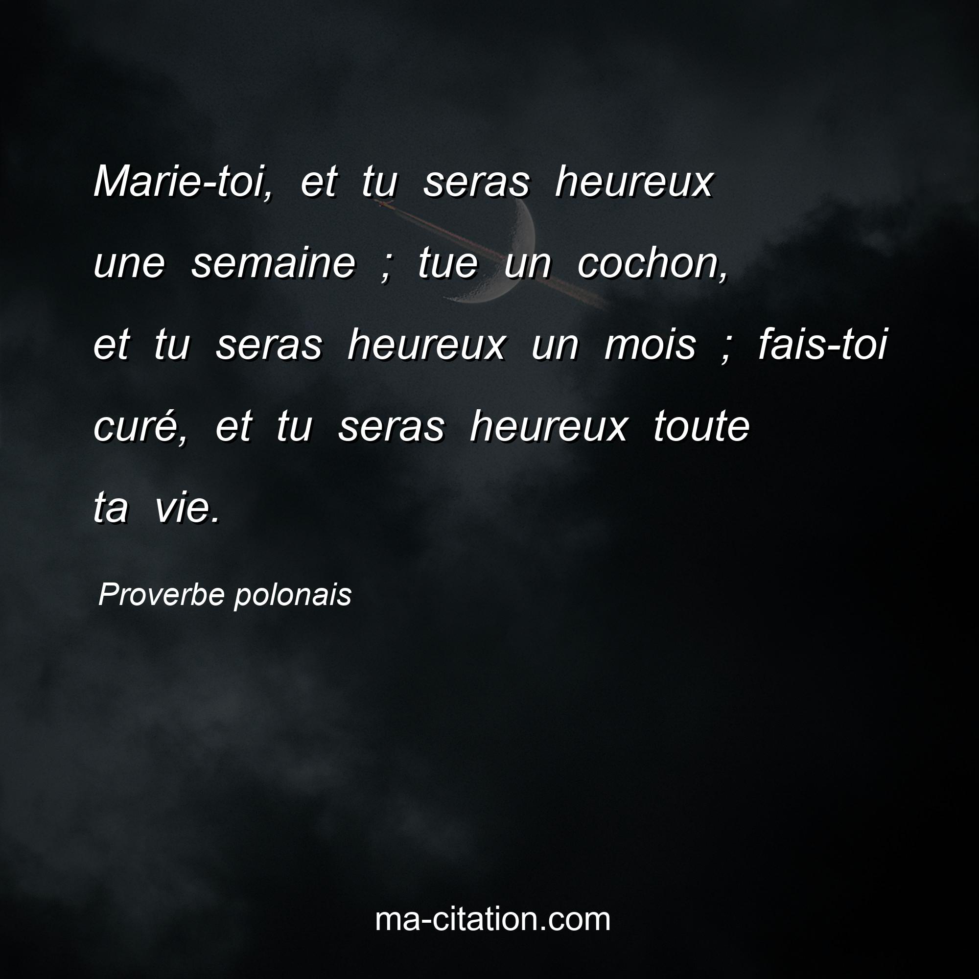 Proverbe polonais sur la vie :Marie-toi, et tu seras heureux une semaine ; tue un cochon, et tu seras heureux un mois ; fais-toi curé, et tu seras heureux toute ta vie.