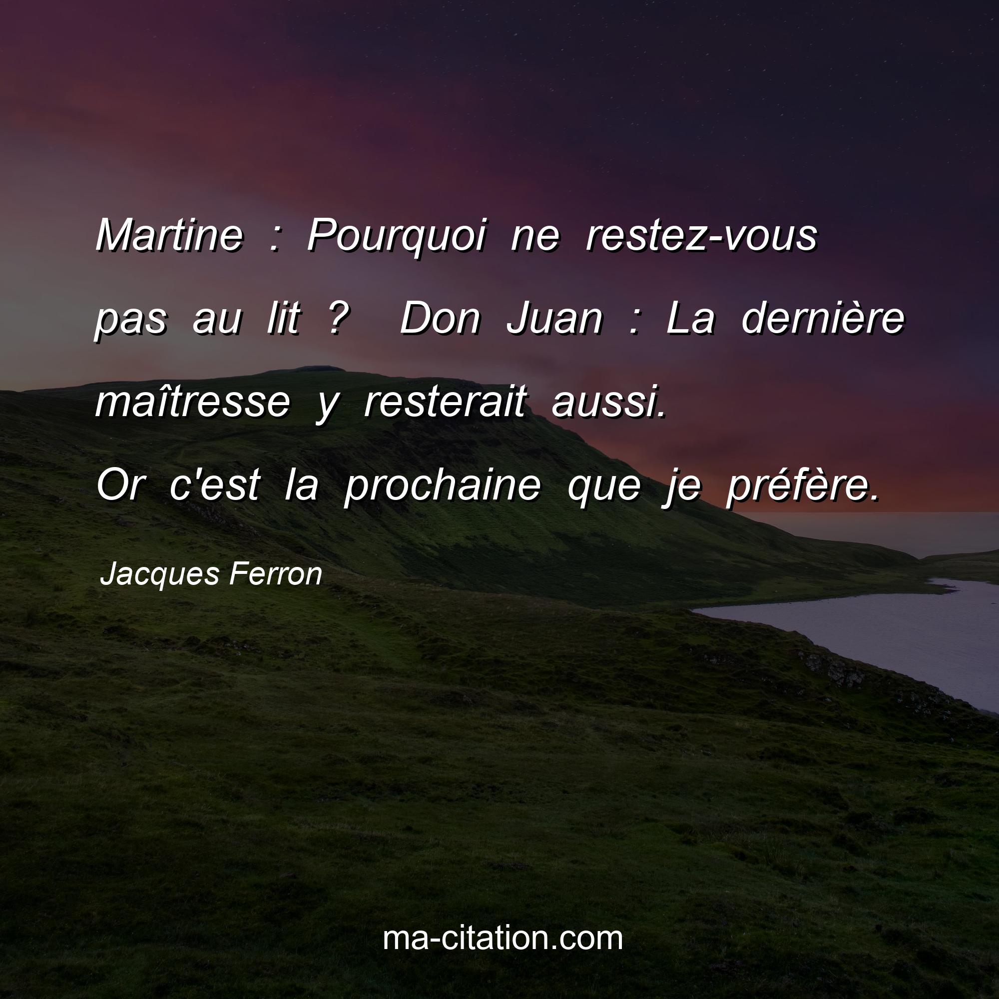 Citation sur la vie de Jacques Ferron :Martine : Pourquoi ne restez-vous pas au lit ? Don Juan : La dernière maîtresse y resterait aussi. Or c'est la prochaine que je préfère.