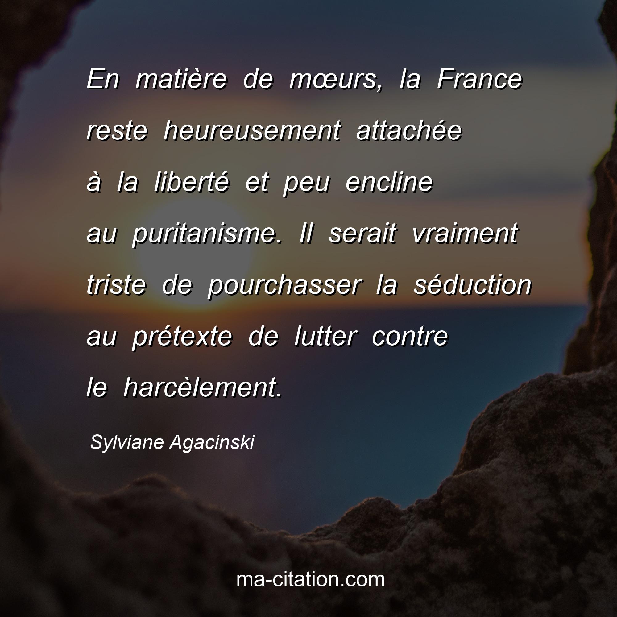 Citation sur la vie de Sylviane Agacinski :En matière de mœurs, la France reste heureusement attachée à la liberté et peu encline au puritanisme. Il serait vraiment triste de pourchasser la séduction au prétexte de lutter contre le harcèlement.