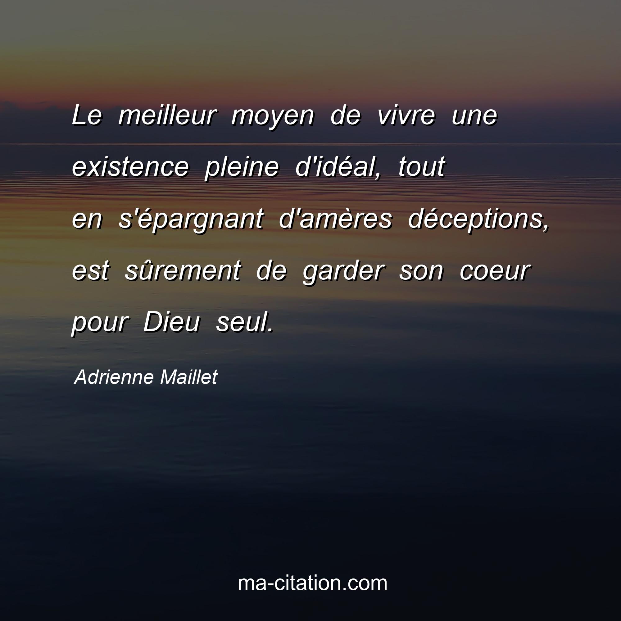 Adrienne Maillet est l'auteur de la citation sur la vie "Le meilleur moyen de vivre une existence pleine d'idéal, tout en s'épargnant d'amères déceptions, est sûrement de garder son coeur pour Dieu seul.".