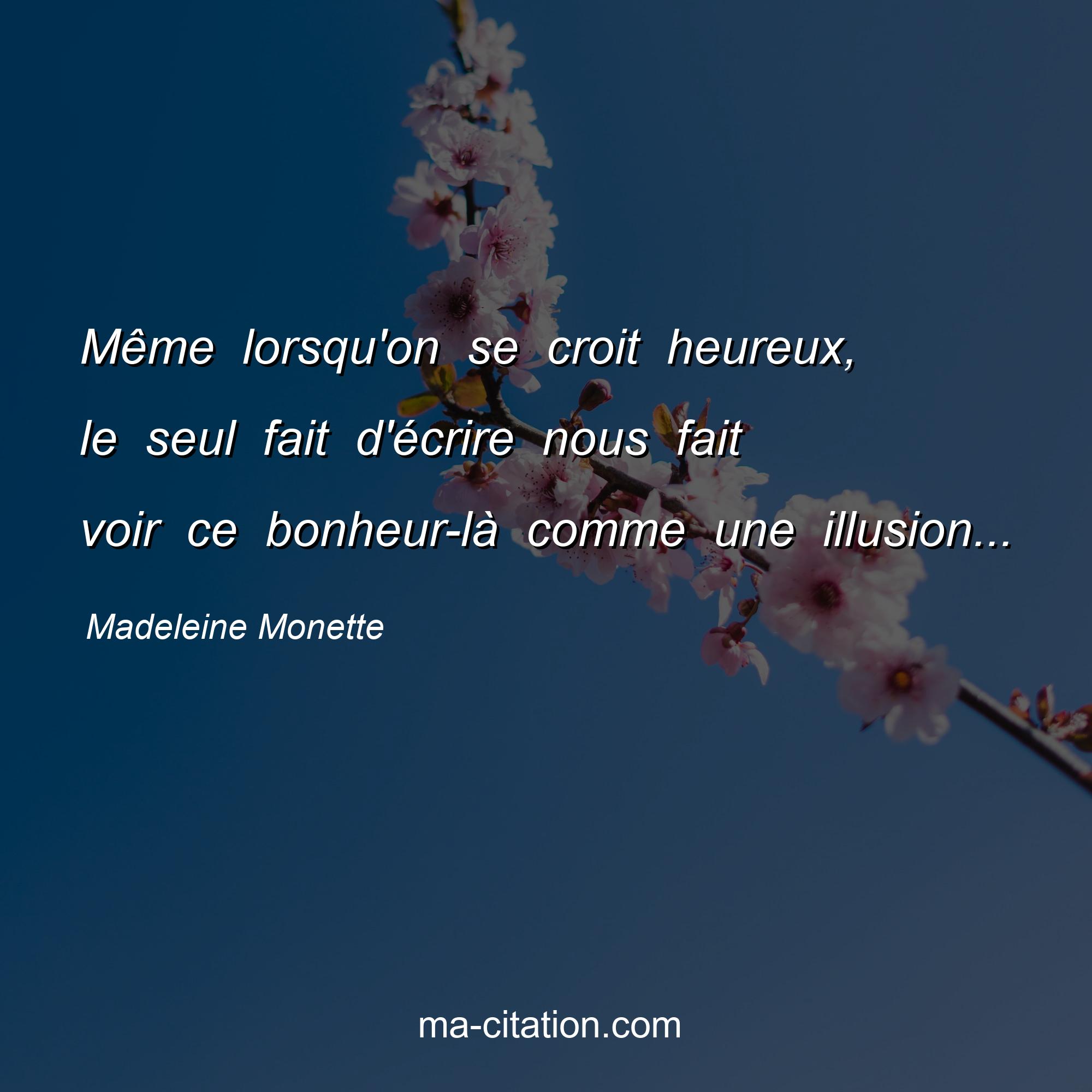 Madeleine Monette est l'auteur de la citation sur la vie "Même lorsqu'on se croit heureux, le seul fait d'écrire nous fait voir ce bonheur-là comme une illusion...".